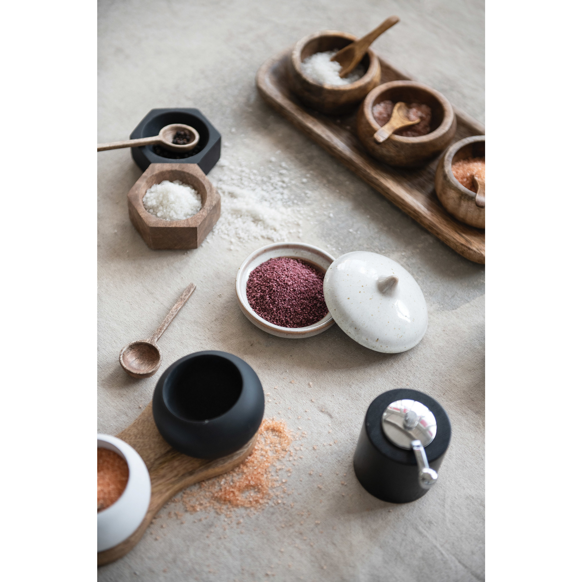 This food-safe, mango wood bowl set is a harmonious blend of functionality and aesthetic appeal. It includes 3 smoothly carved bowls, each accompanied by a matching spoon, all elegantly presented on a sturdy tray. The natural grain of the mango wood adds a warm, inviting tone to the set, making it a delightful addition to any meal that requires the use of spices and condiments. With its practical measurements of 13.5 inches in length, 5.5 inches in width, and 2 inches in height, it offers ample space for a variety of seasonings without overwhelming any table space. To preserve its beauty, the set is best cared for by hand washing only.