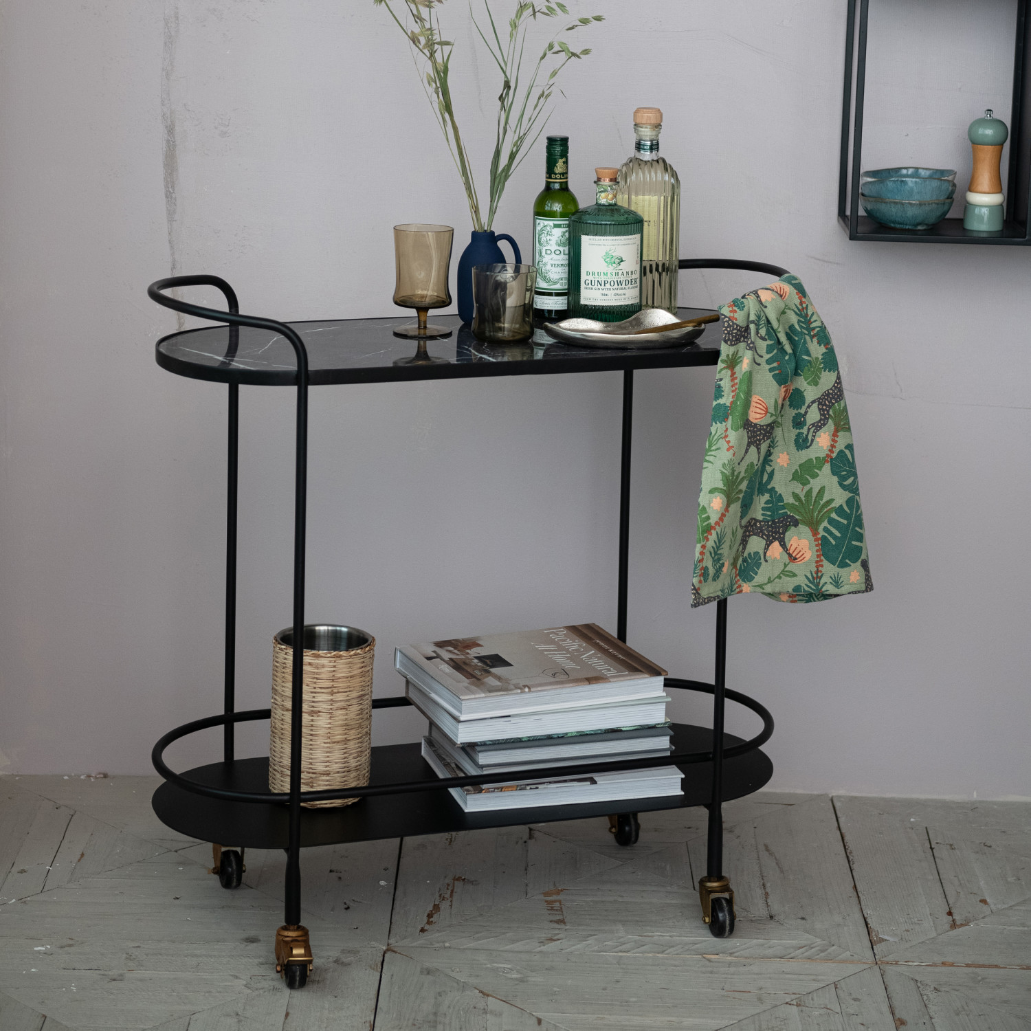 Metal & Marbled Veneer 2-Tier Bar Cart on Casters, Matte Black