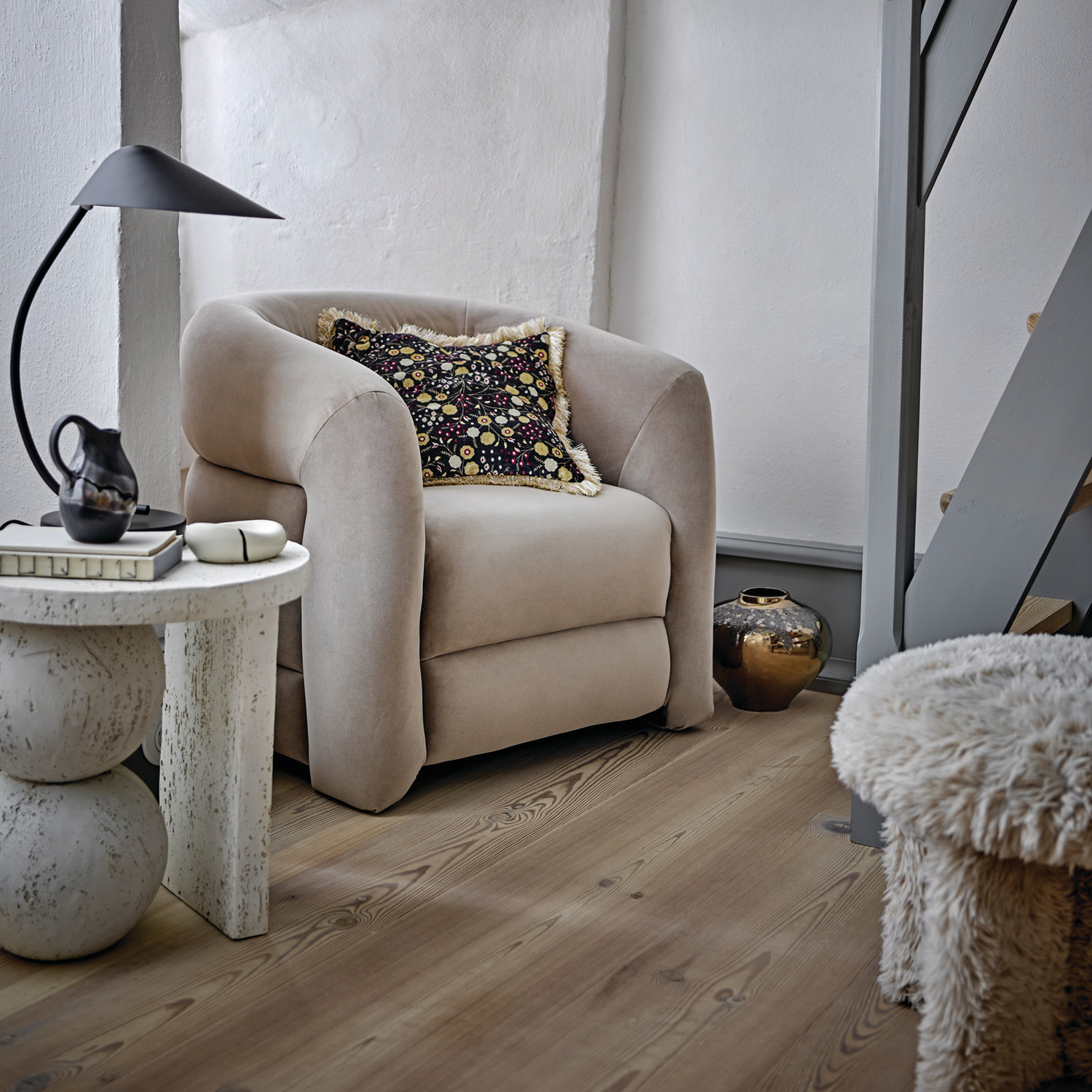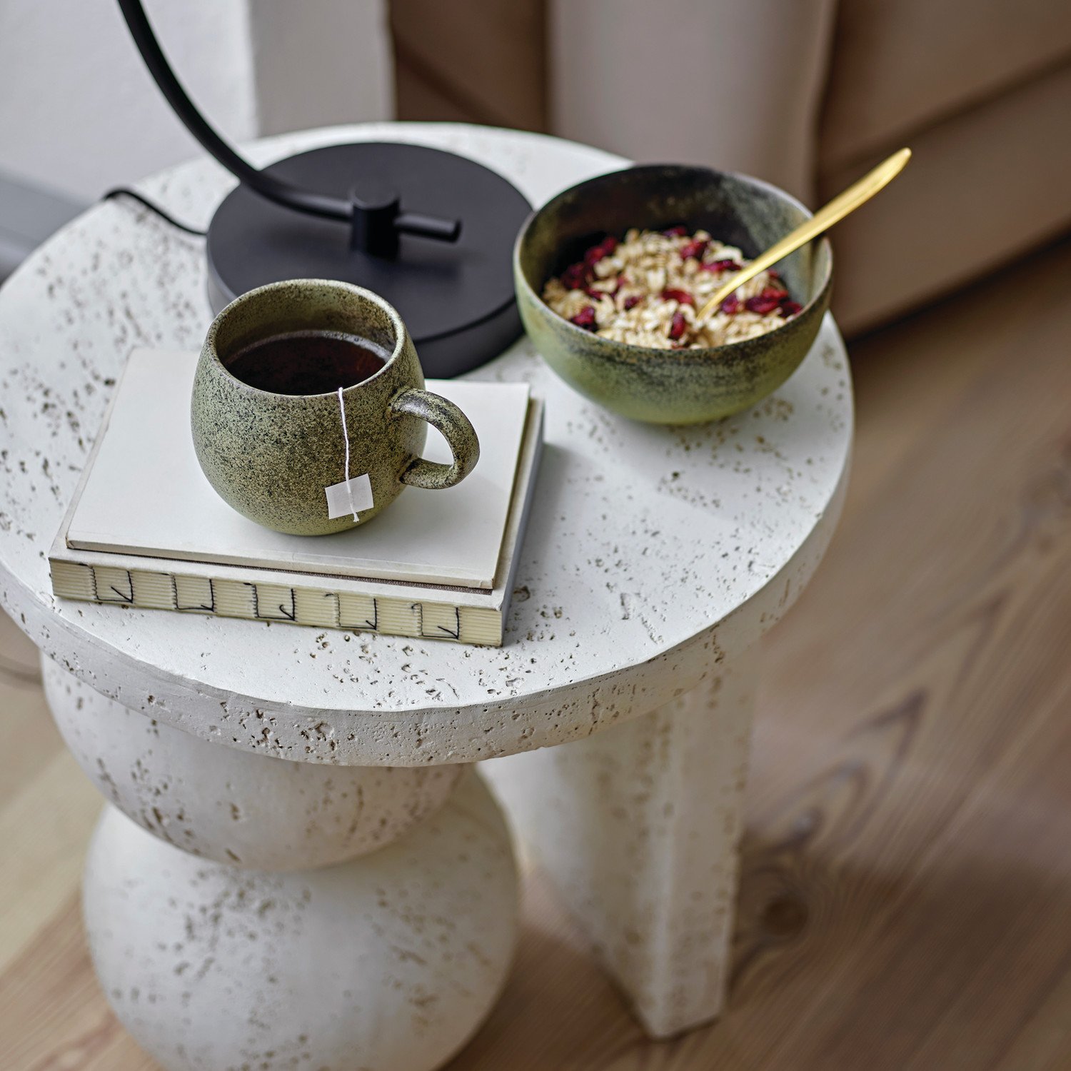 Resin Table with Stacked Ball Base, Travertine Finish, Cream Color