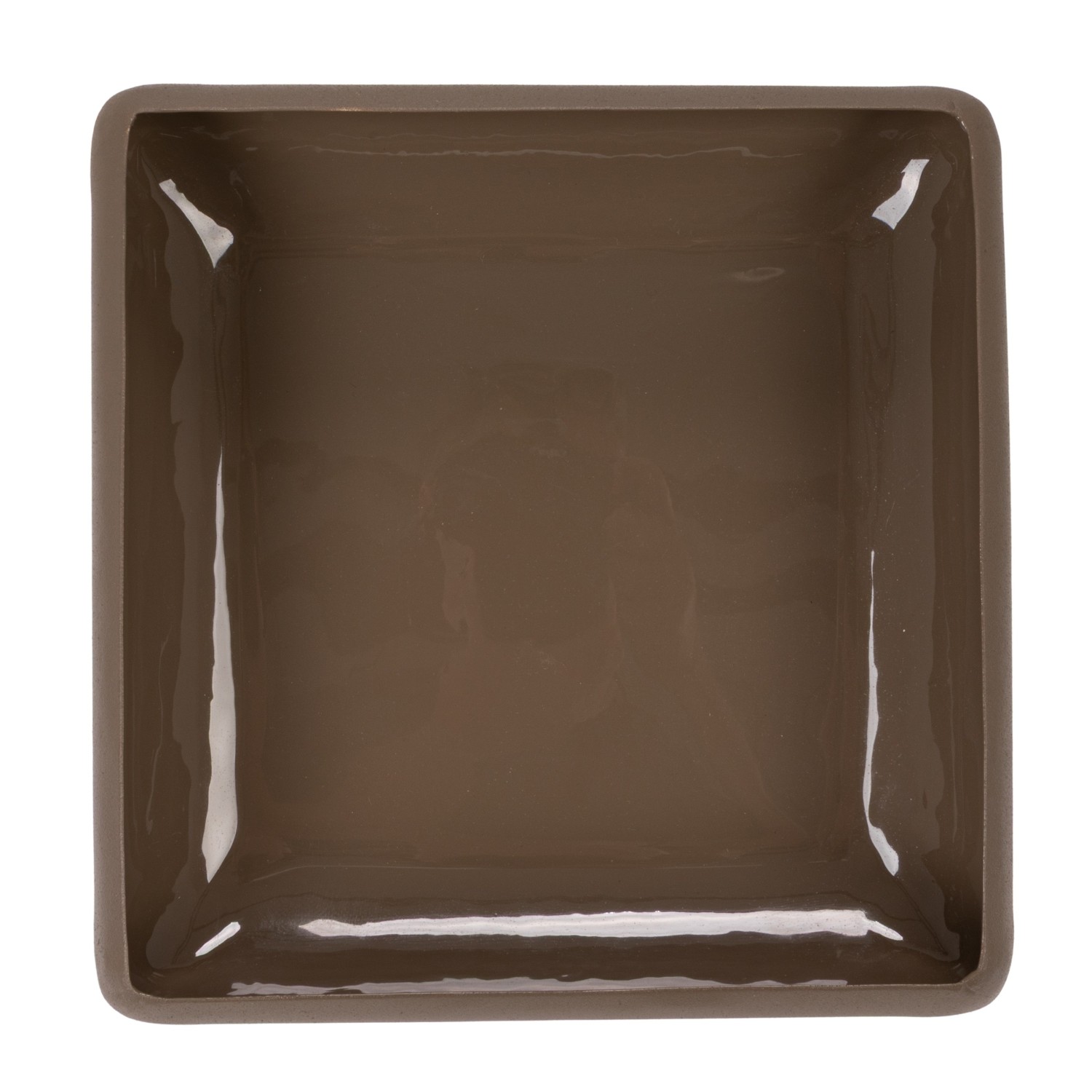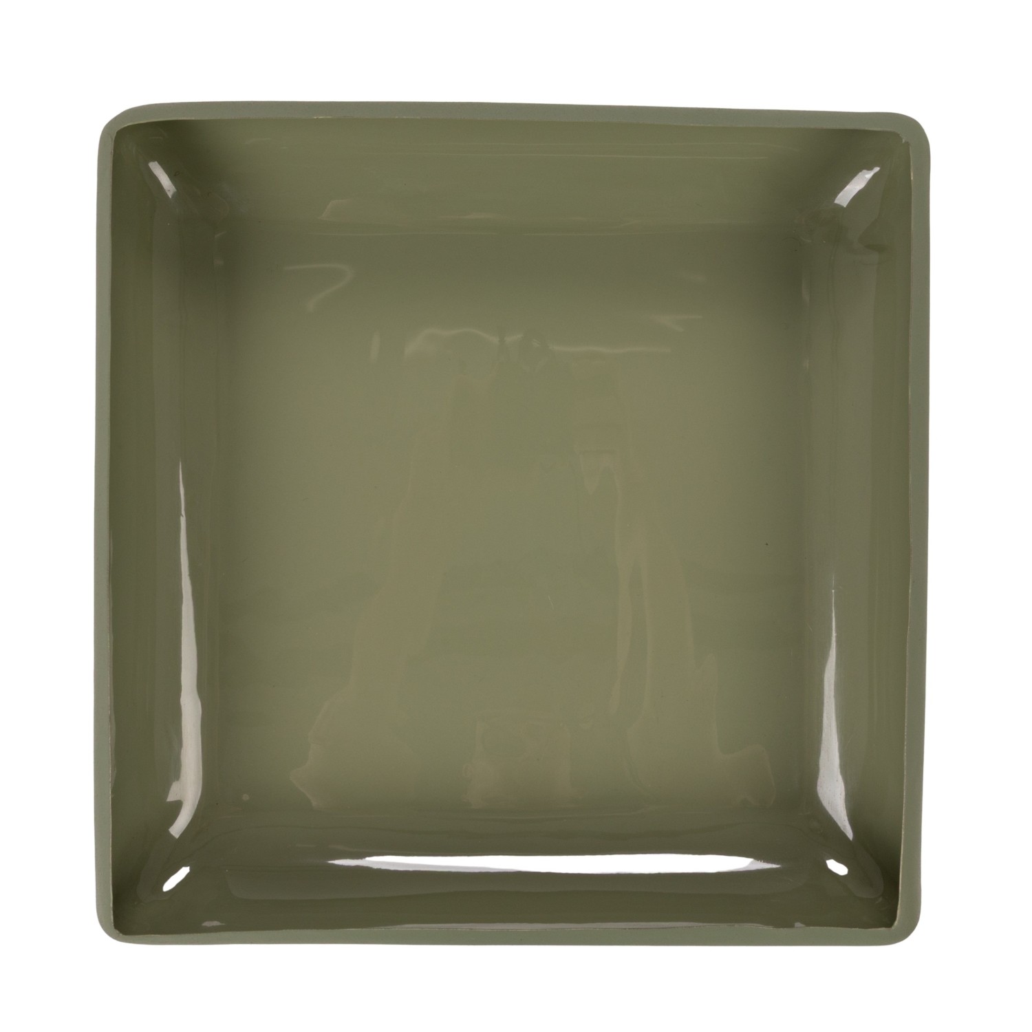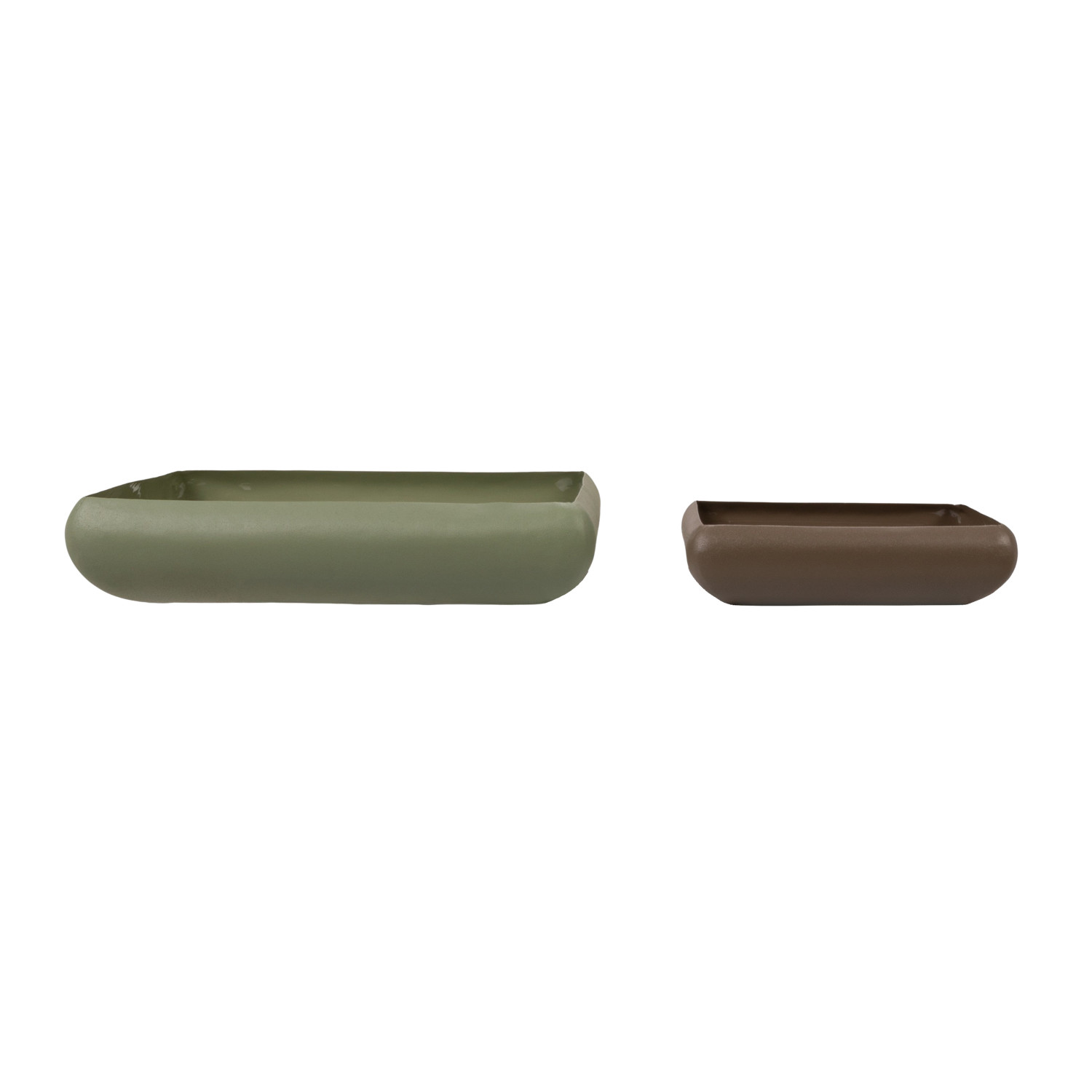 Catalog Name: 13-1/2" Square x 2-3/4"H & 8-1/2" Square x 2"H Decorative Enameled Metal Trays, Sand Finish, Olive Color & Brown, Set of 2