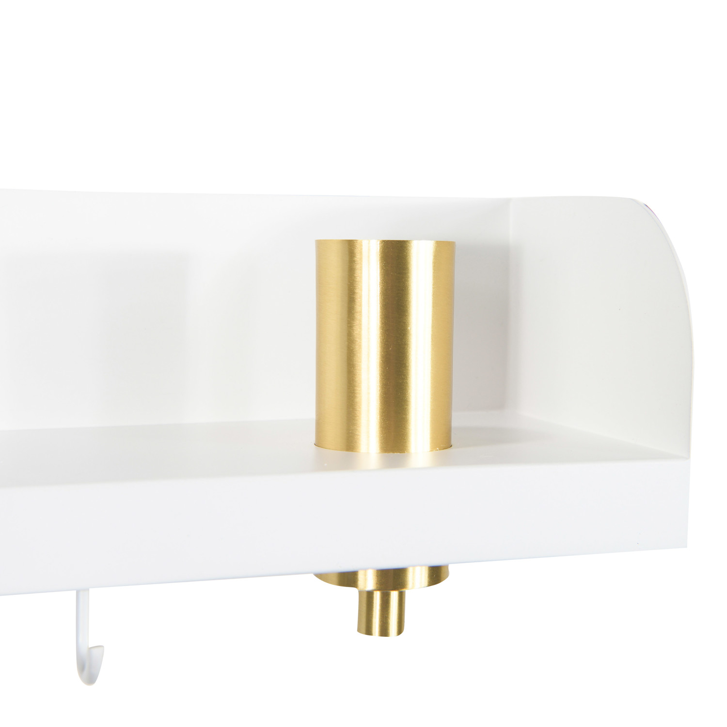 Catalog Name: 15-3/4"W x 4-1/2"D x 4-3/4"H Metal Wall Shelf w/ Light, USB, 3 Hooks & Inline Switch, Gold Finish, White