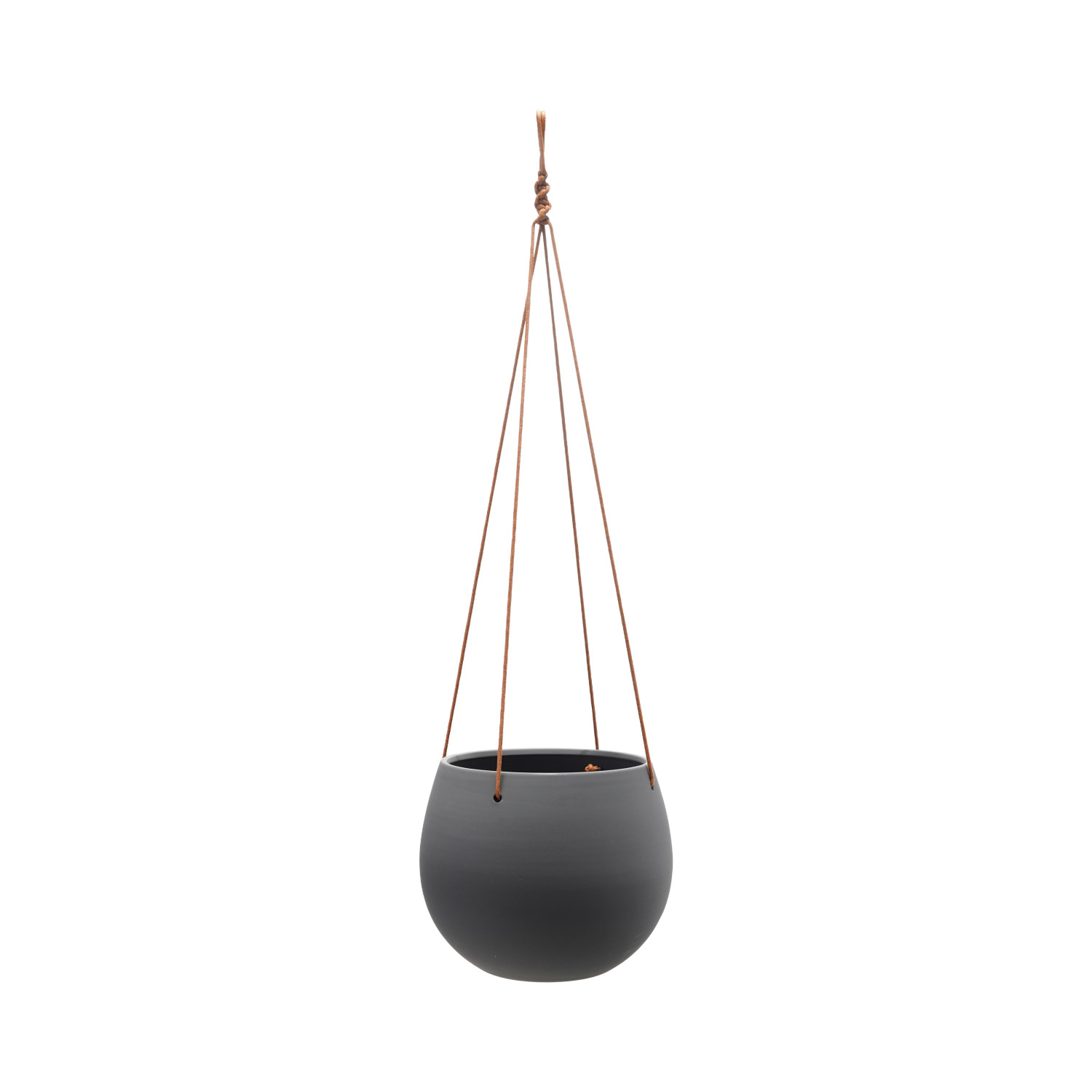 Catalog Name: 8-3/4" Round x 7-1/4"H Hanging Stoneware Planter w/ Leather Rope Hanger, Latex Glaze, Charcoal Color (Holds 7" Pot)