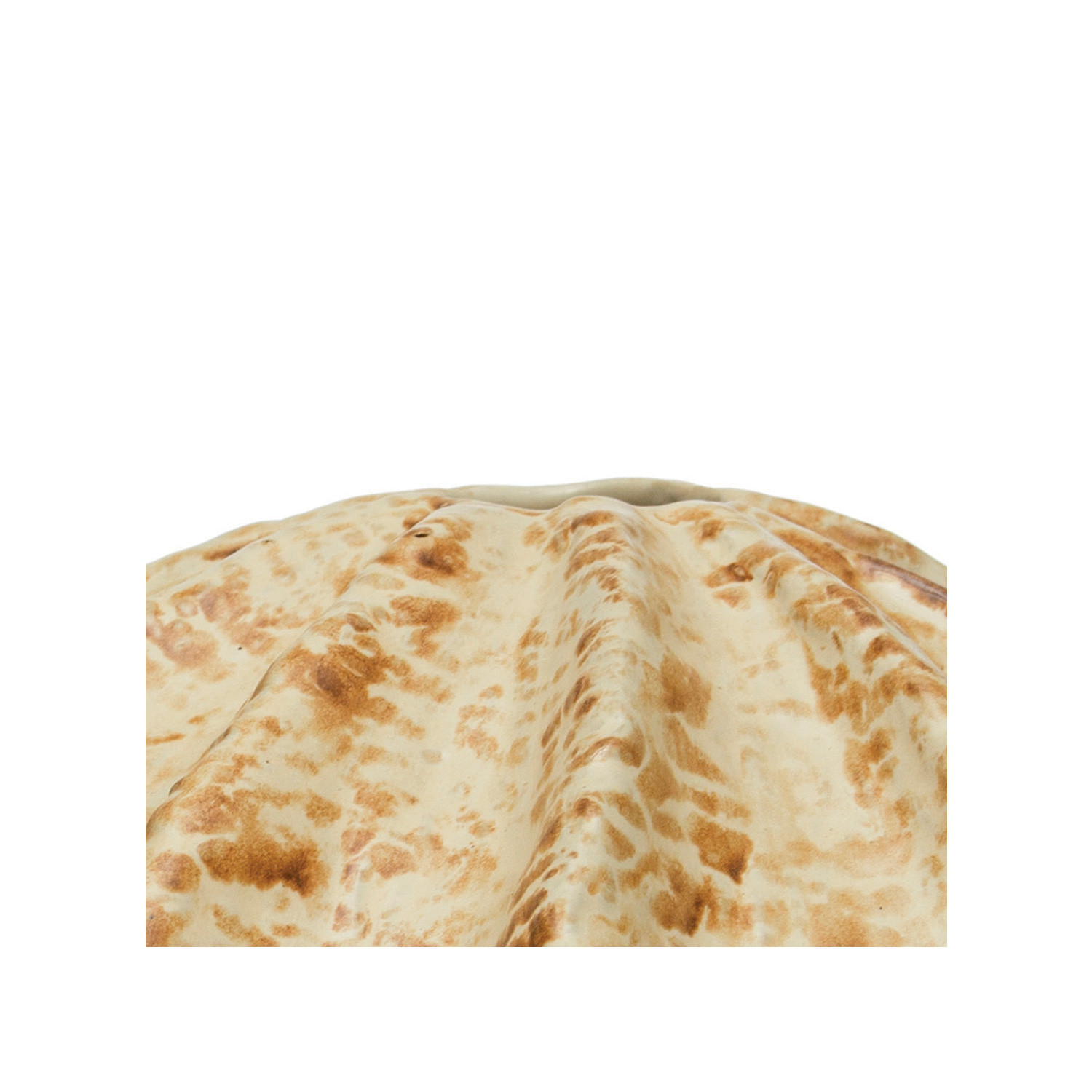 This shell-shaped stoneware vase with a reactive glaze in a warm tan hue is the perfect way to add a touch of oceanic flair to the home decor. The vase's unique shape and versatile size make it a perfect way to display a variety of flowers, plants, or other decorative items. The stoneware material is durable and long-lasting, and the reactive glaze gives the vase a unique, one-of-a-kind finish. The vase is also easy to care for, simply wipe it down with a damp cloth to keep it looking its best. The vase measures 8 inches in diameter and 4 inches tall, making it a perfect size for a coffee table, bookshelf, or mantle. This vase is the perfect way to add a touch of coastal style to any space. Whether looking for a unique centerpiece for the dining table or a stylish way to display shells, this vase is sure to impress. A stunning shell-shaped vase made of stoneware with a reactive glaze in a warm tan hue adds an oceanic vibe to the decor. This versatile vase would look great in a variety of home décor styles, from coastal to bohemian to mid-century modern. This decorative vase is versatile and can be used to hold a variety of flowers, plants, or other decorative items. Made of stoneware.
