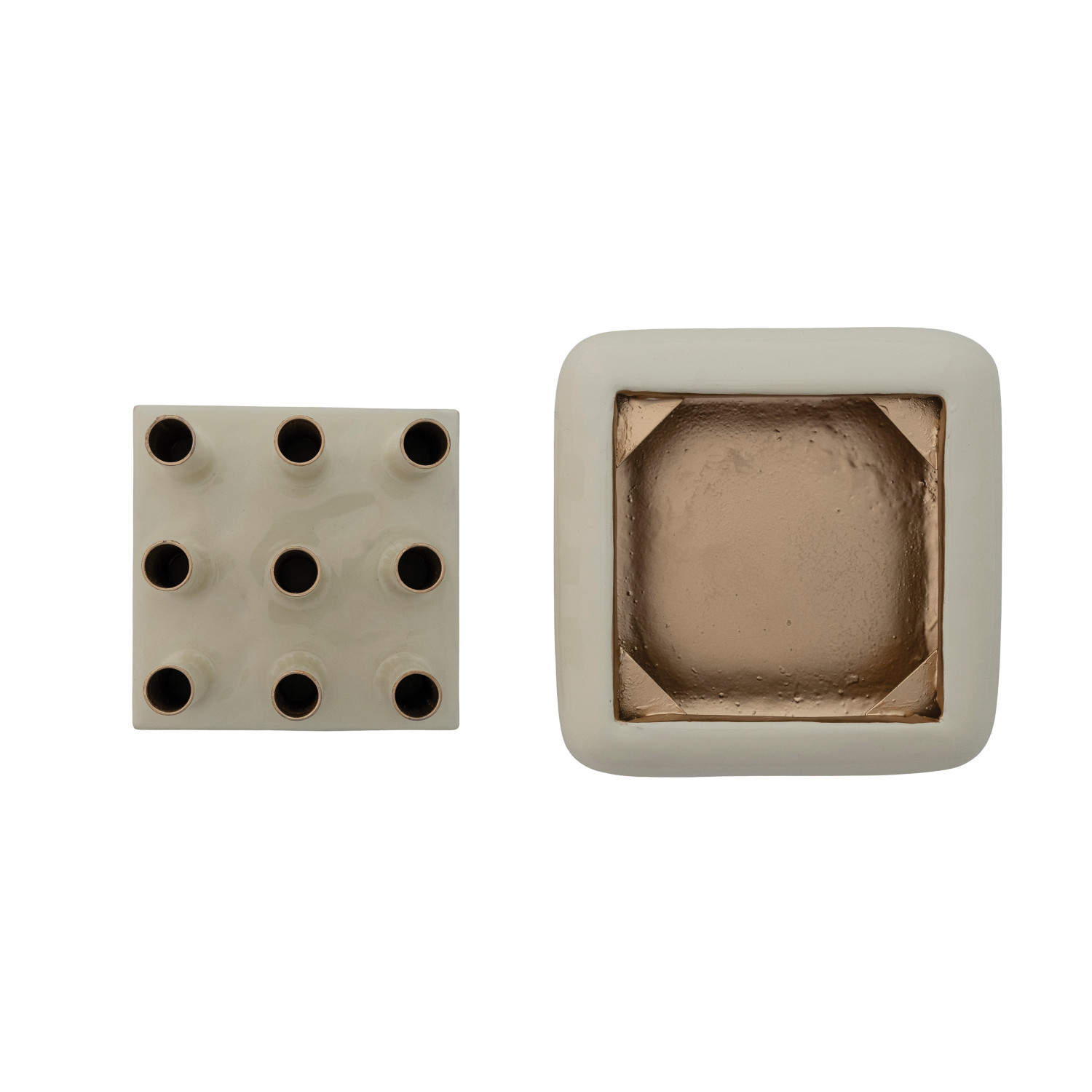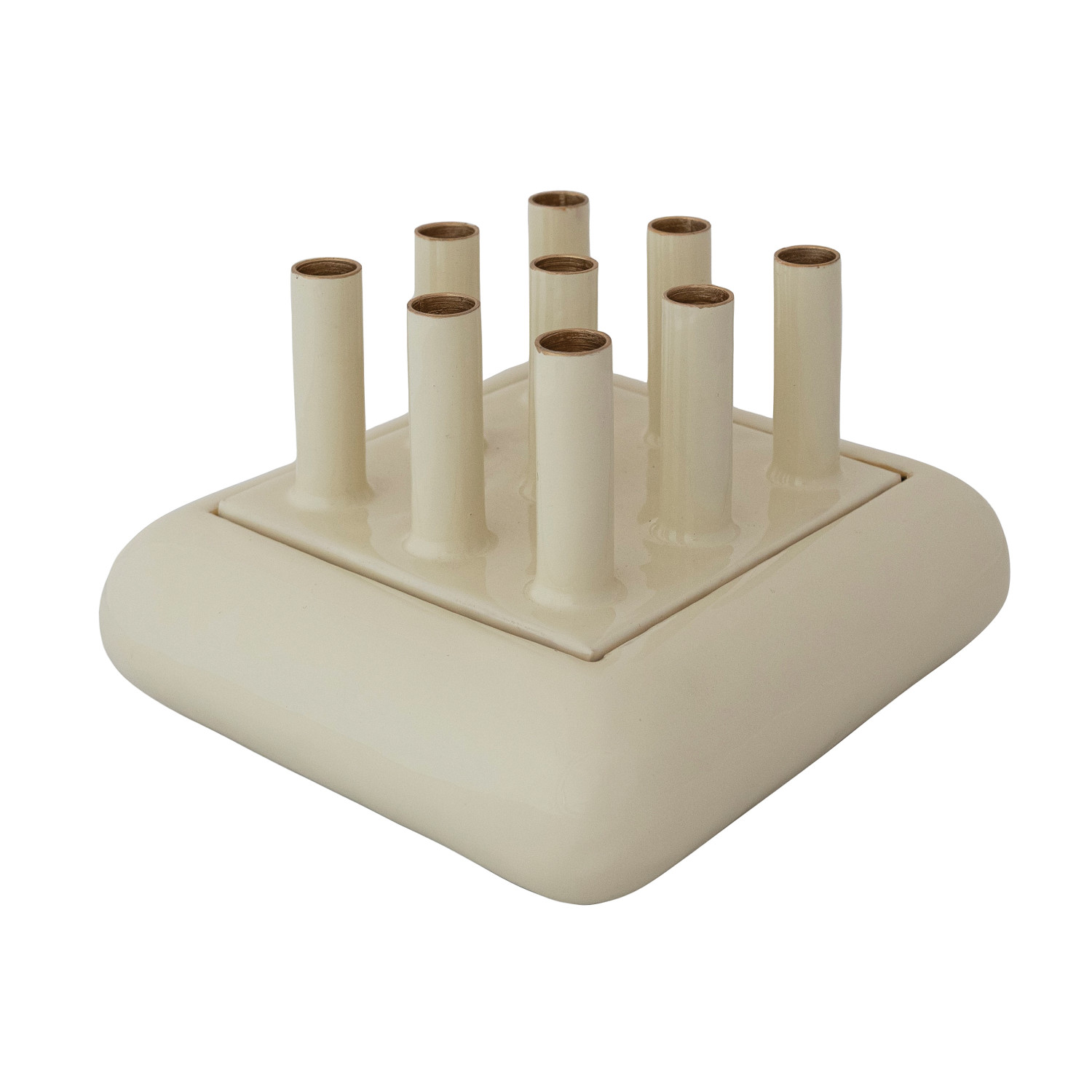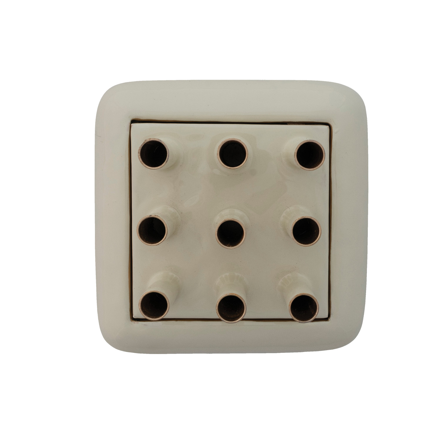 Catalog Name: 8-1/4" Square x 5-3/4"H Enameled Metal Multi-Stem Flower Vase w/ Removable Frog Lid & 9 Openings, Cream Color