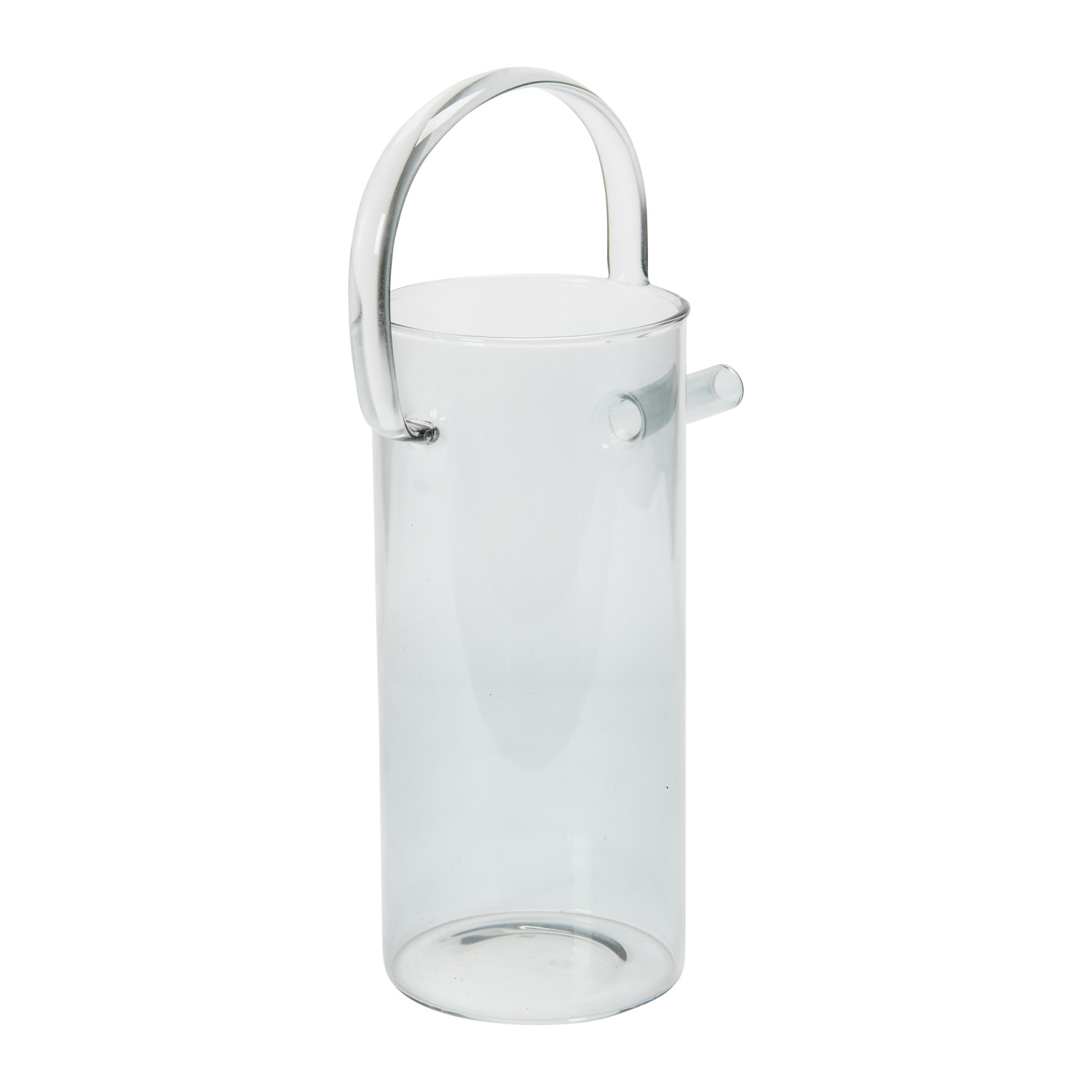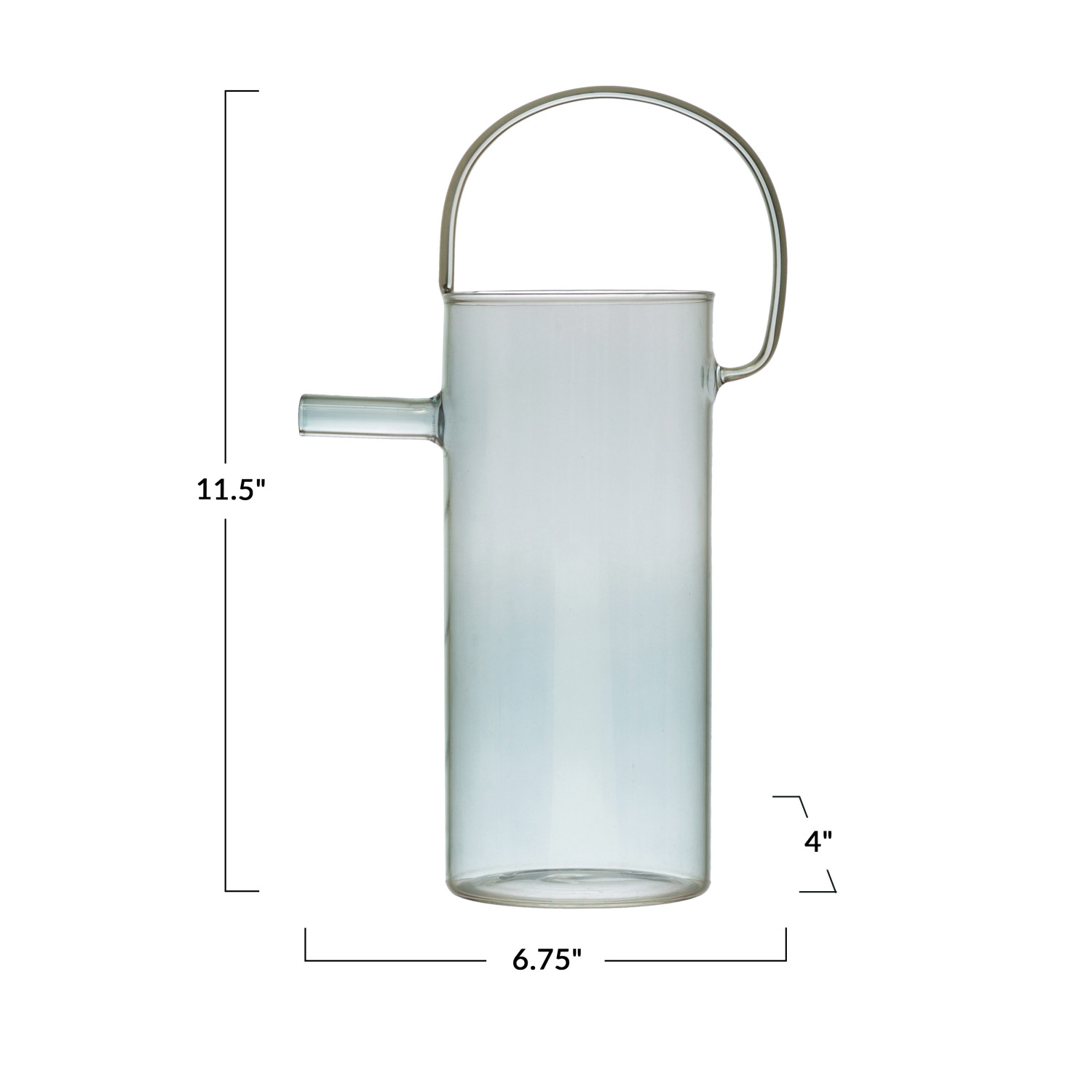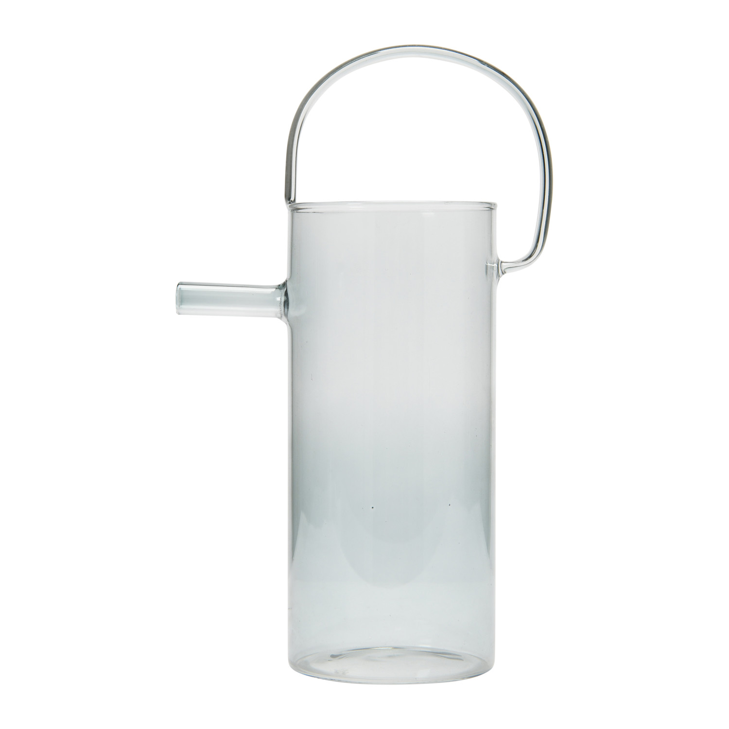This mid-century modern pitcher showcases a stunningly sleek glass silhouette in a subtle transparent hue. Glass pitcher in blue. Add a hint of modern art to any living space or tablescape with this contemporary watering can. Made from 100% glass.