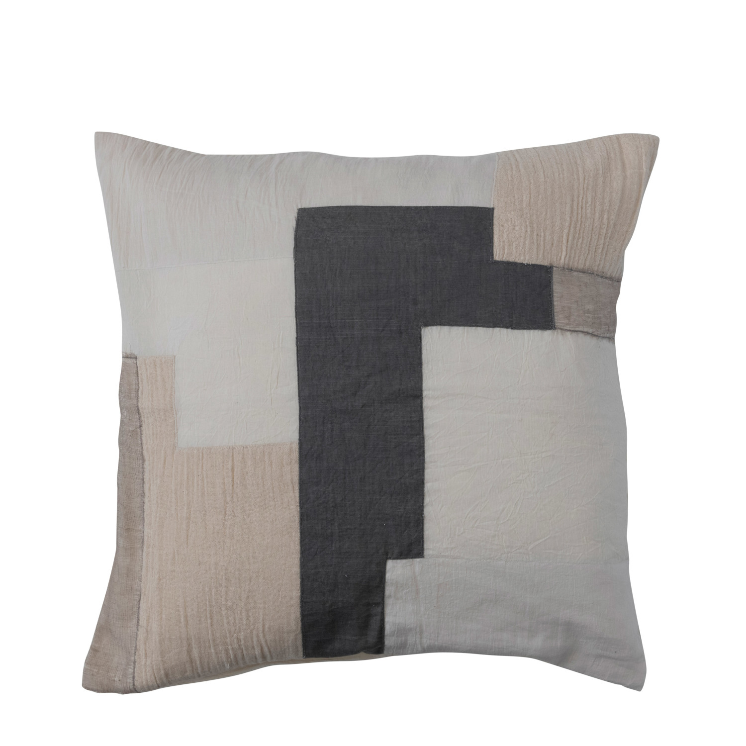 This modern throw pillow showcases cotton construction in a patchwork geometric design. Includes polyfill insert. Machine Wash Warm Gentle Cycle, Do Not Bleach, Tumble Dry Low, Warm Iron If Needed. Made from cotton and polyester.