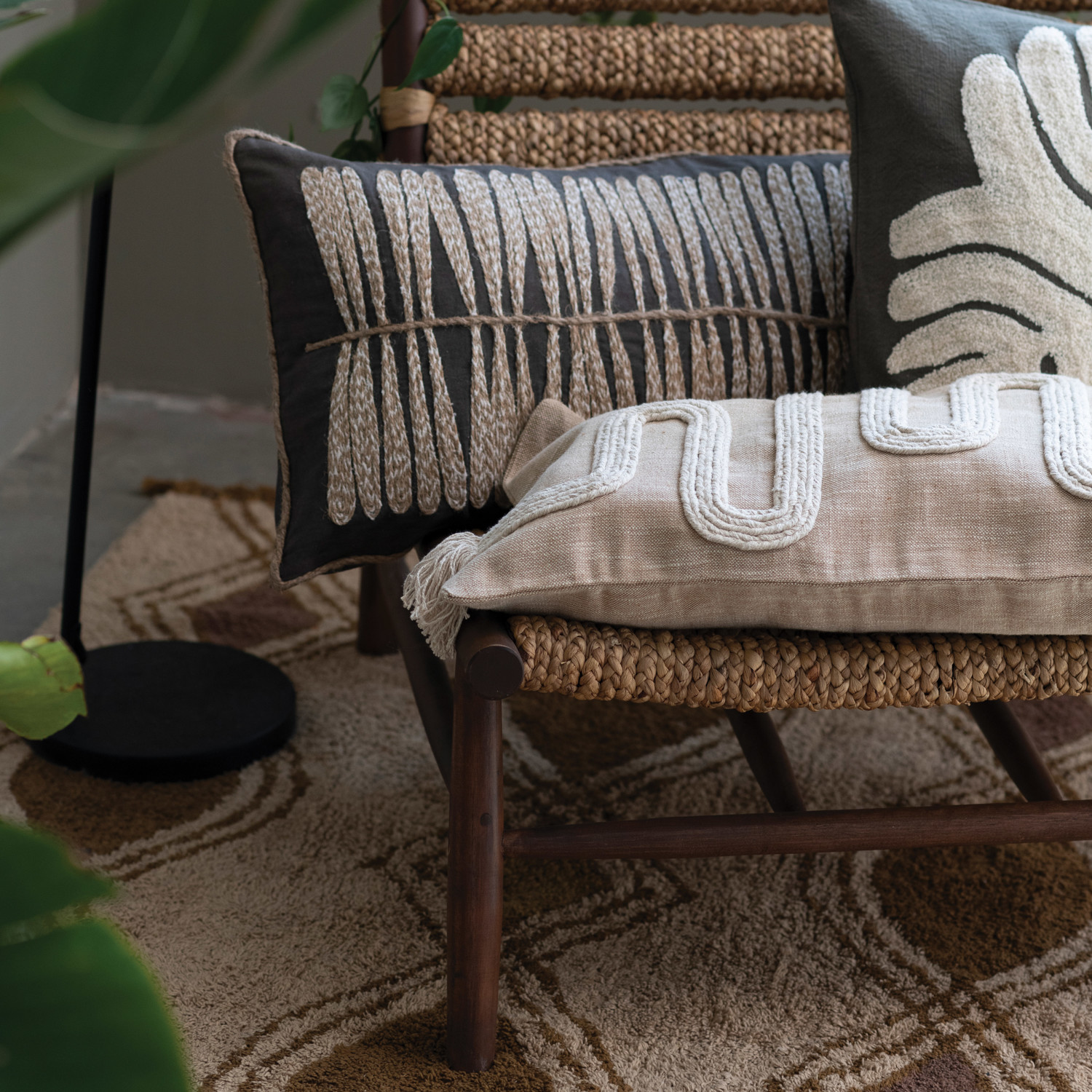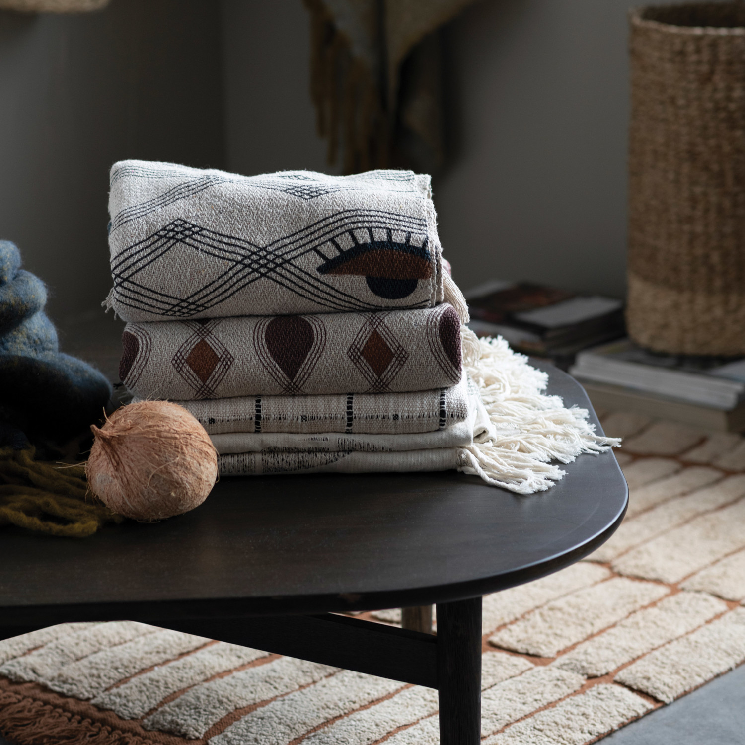 This bold cotton rug showcases a striking geometric pattern and soft decorative fringe.