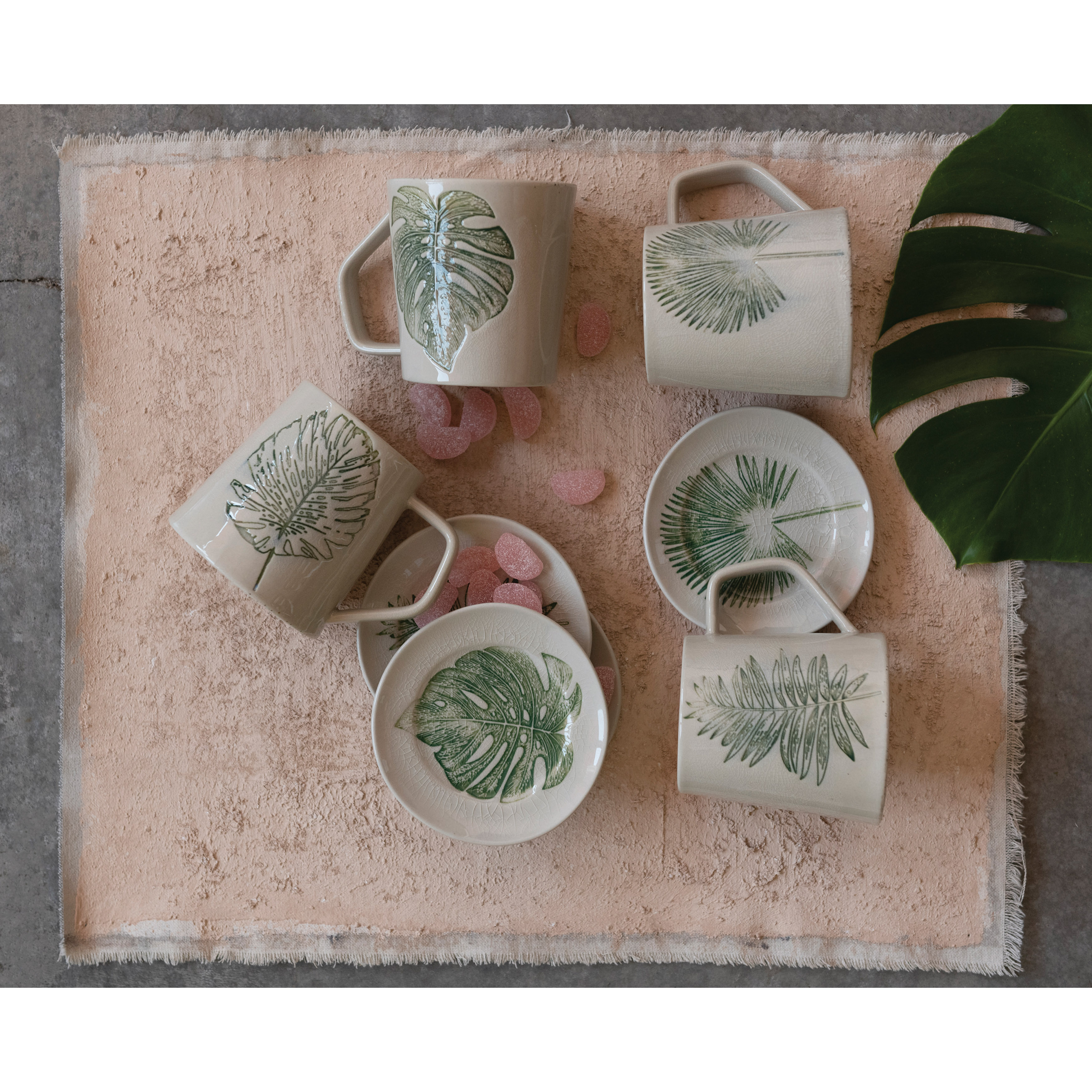 Catalog Name: 3-3/4" Round x 4"H 14 oz. Stoneware Mug w/ Debossed Leaf Image, Reactive Crackle Glaze, Cream Color & Green, 4 Styles (Each One Will Vary)