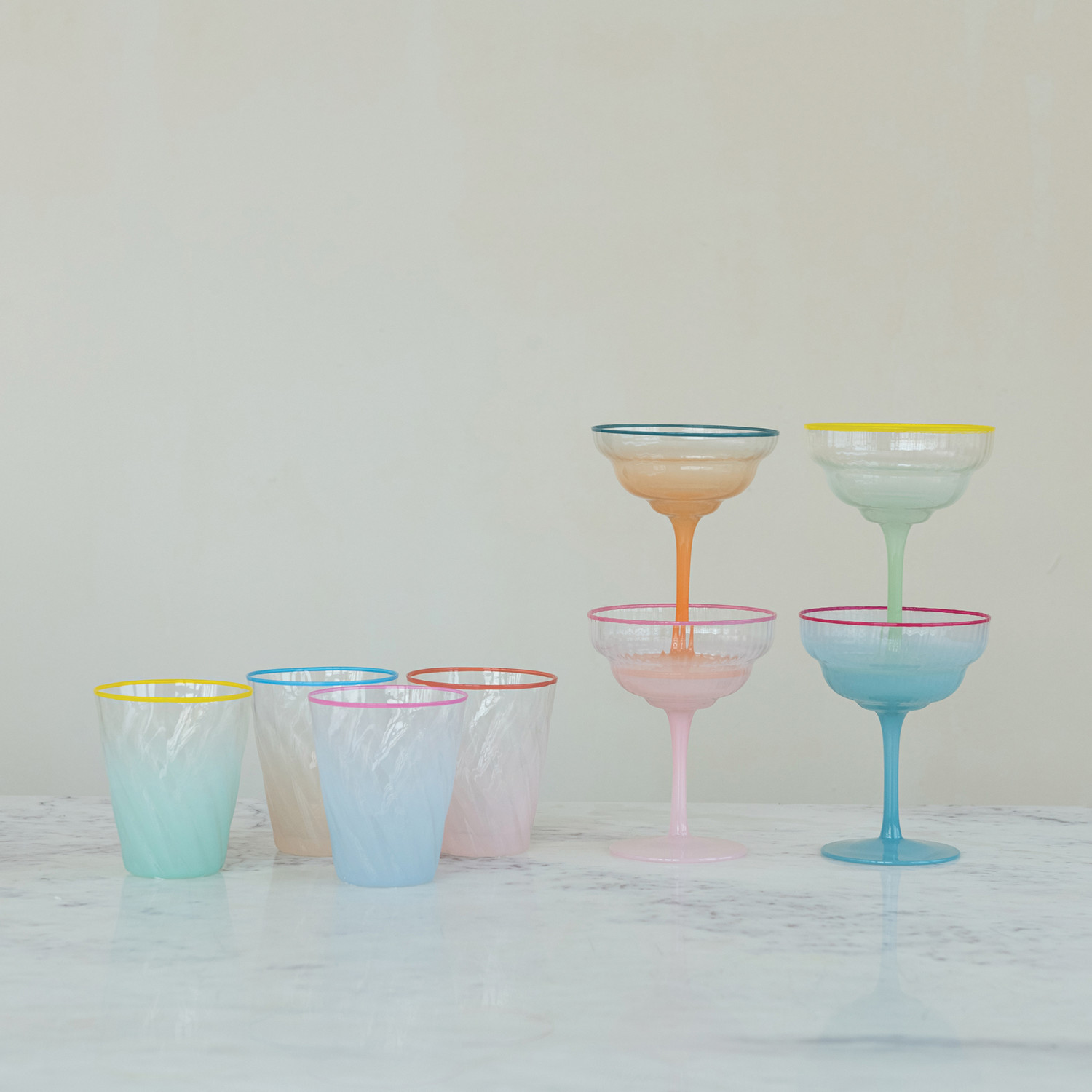 4 oz. Fluted Stemmed Coupe Glass with Colored Rim, 4 Ombre Colors