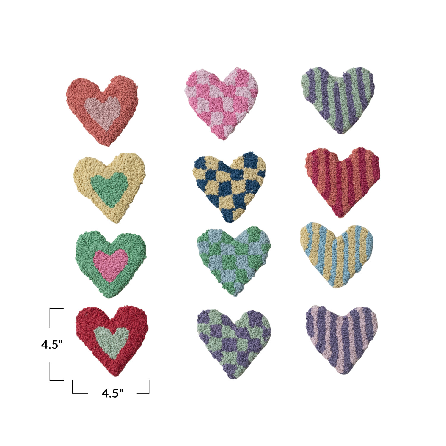 Catalog Name: 4-1/2"L x 4-1/2"W Cotton Tufted Heart-Shaped Coaster w/ Heart/Stripes/Check Pattern, Multi Color, 12 Styles