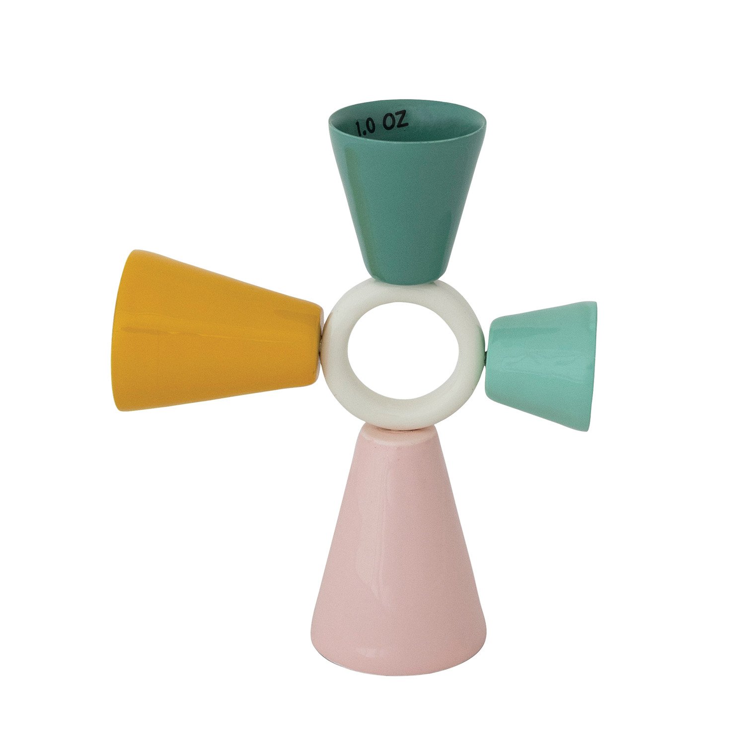 Catalog Name: 6"L x 5"W 0.5 oz. - 2 oz. Enameled Metal 4-Way Jigger, Multi Color