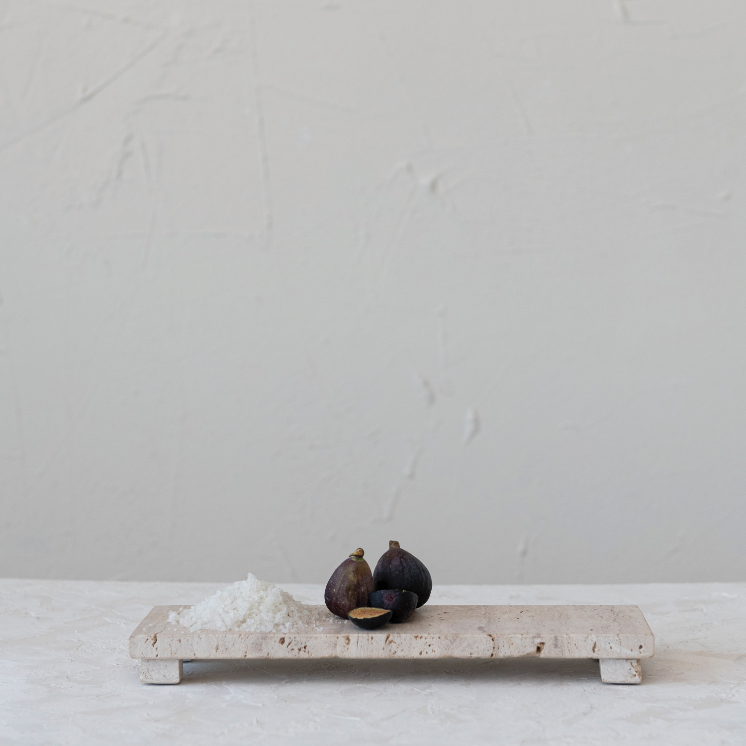 This travertine footed serving board is a stylish and elegant accessory for the kitchen. It features a travertine surface with a textural and naturally variating beige color that creates a stunning look. The travertine is also durable and porous and has a unique pattern and color that adds visual interest and contrast to the food. The serving board also has feet that elevate it from the table or countertop, making it easy to carry and move around. Whether serving cheese, snacks, or other foods, this serving board will impress with its style and functionality. It measures 12 inches long and 4 inches wide, giving ample room to work with. This cutting board will make a great addition to the kitchen or a thoughtful gift for someone special. A stylish and elegant serving board made of travertine with a textural and naturally variating beige color and feet. Ideal for adding a touch of farmhouse and cottage to the kitchen or dining table. Hand wash only with mild soap and water, and dry thoroughly. Made from travertine.