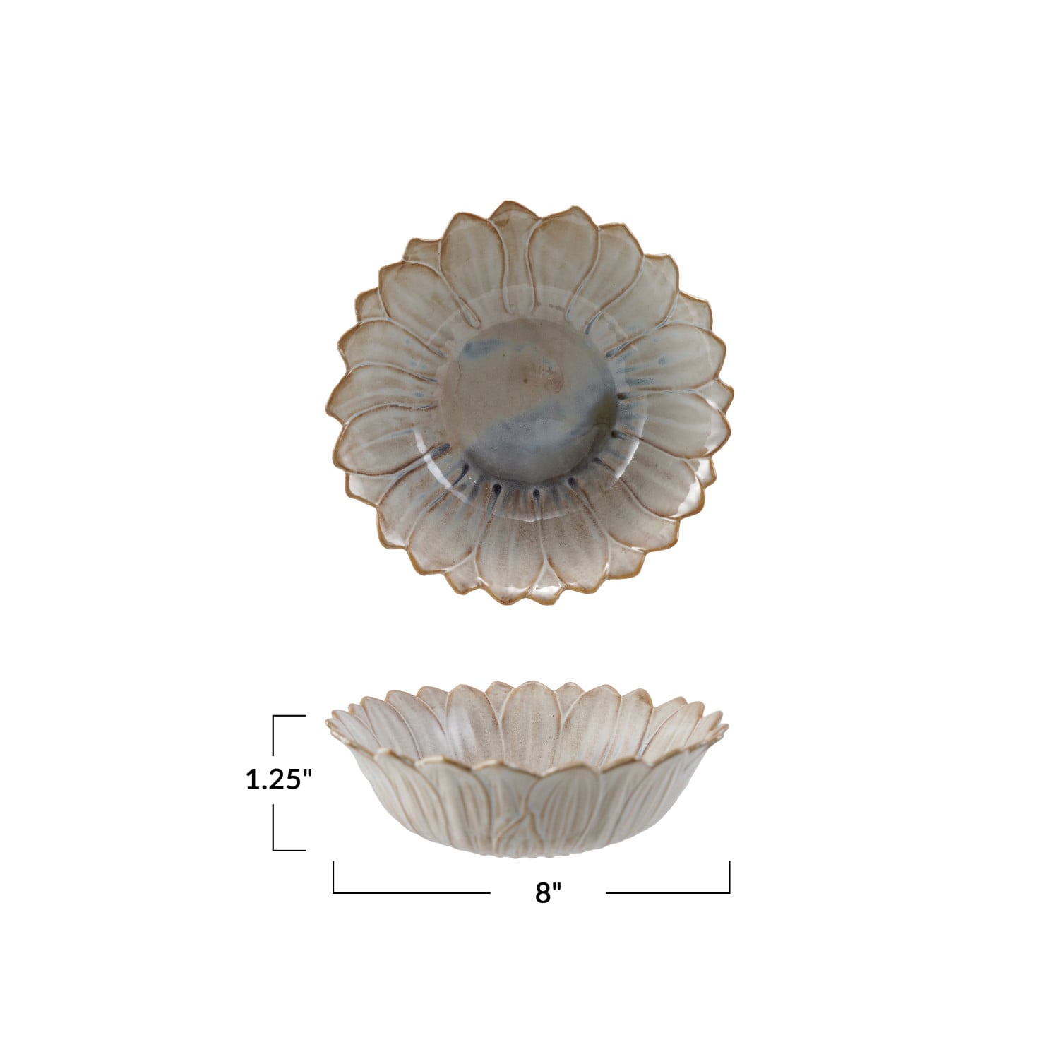 Catalog Name: 8" Round x 1-1/4"H Stoneware Flower Shaped Bowl, Reactive Glaze, White & Blue (Each One Will Vary)