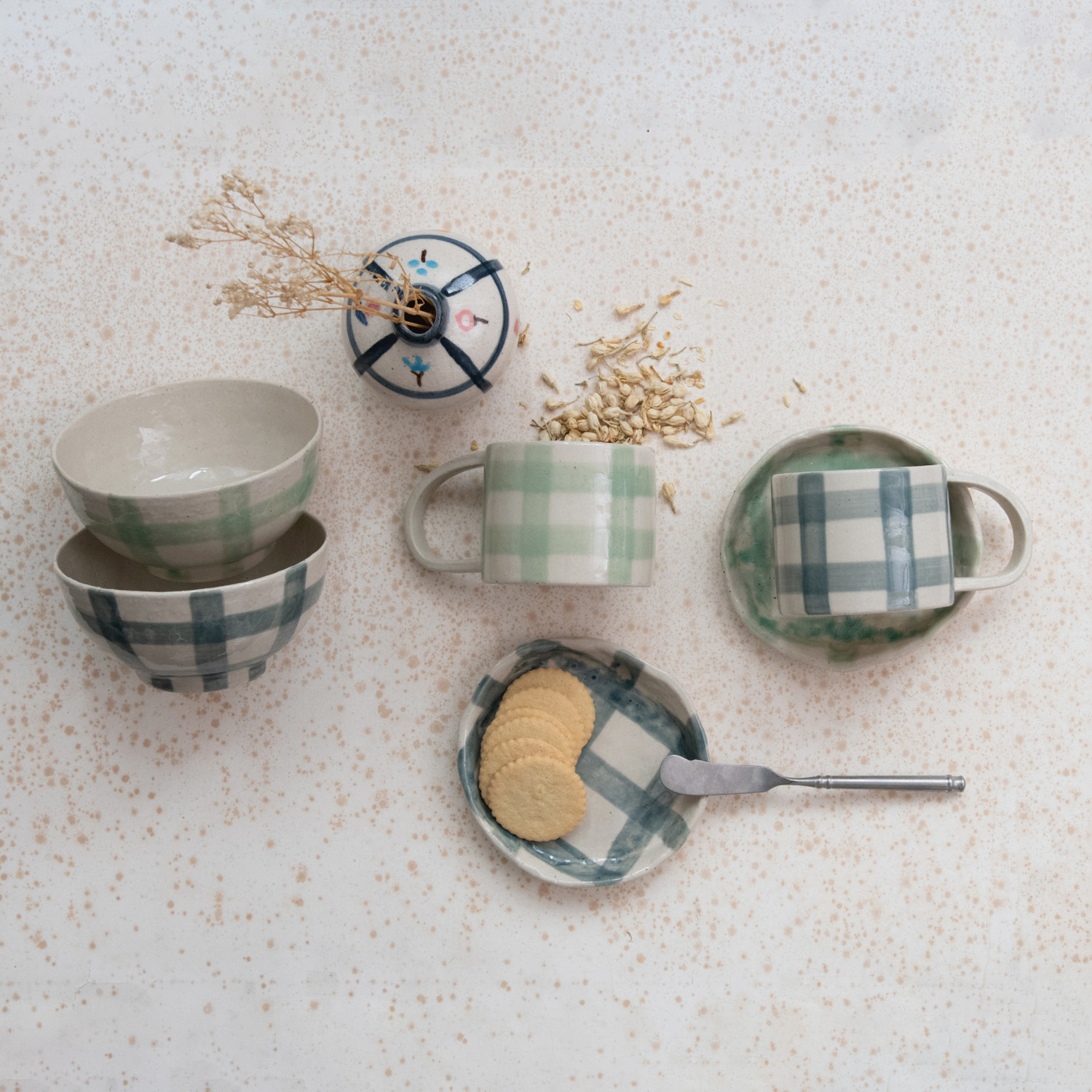 Hand-Painted Stoneware Bowl w/ Grid Pattern, Reactive Glaze, 2 Colors (Each One Will Vary)