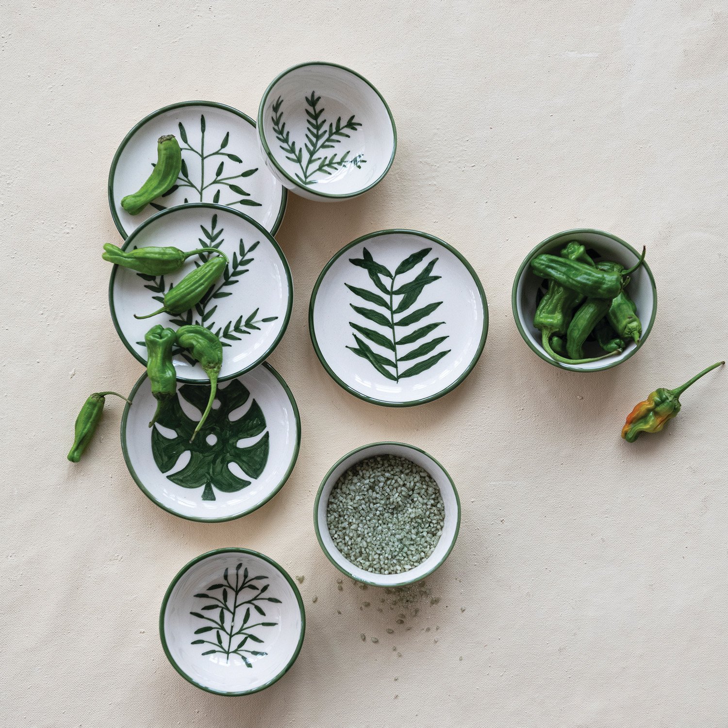 Catalog Name: 4" Round x 1-3/4"H Hand-Painted Stoneware Bowl w/ Pattern & Botanical Inside, Cream Color & Dark Green, 4 Styles (Each One Will Vary)