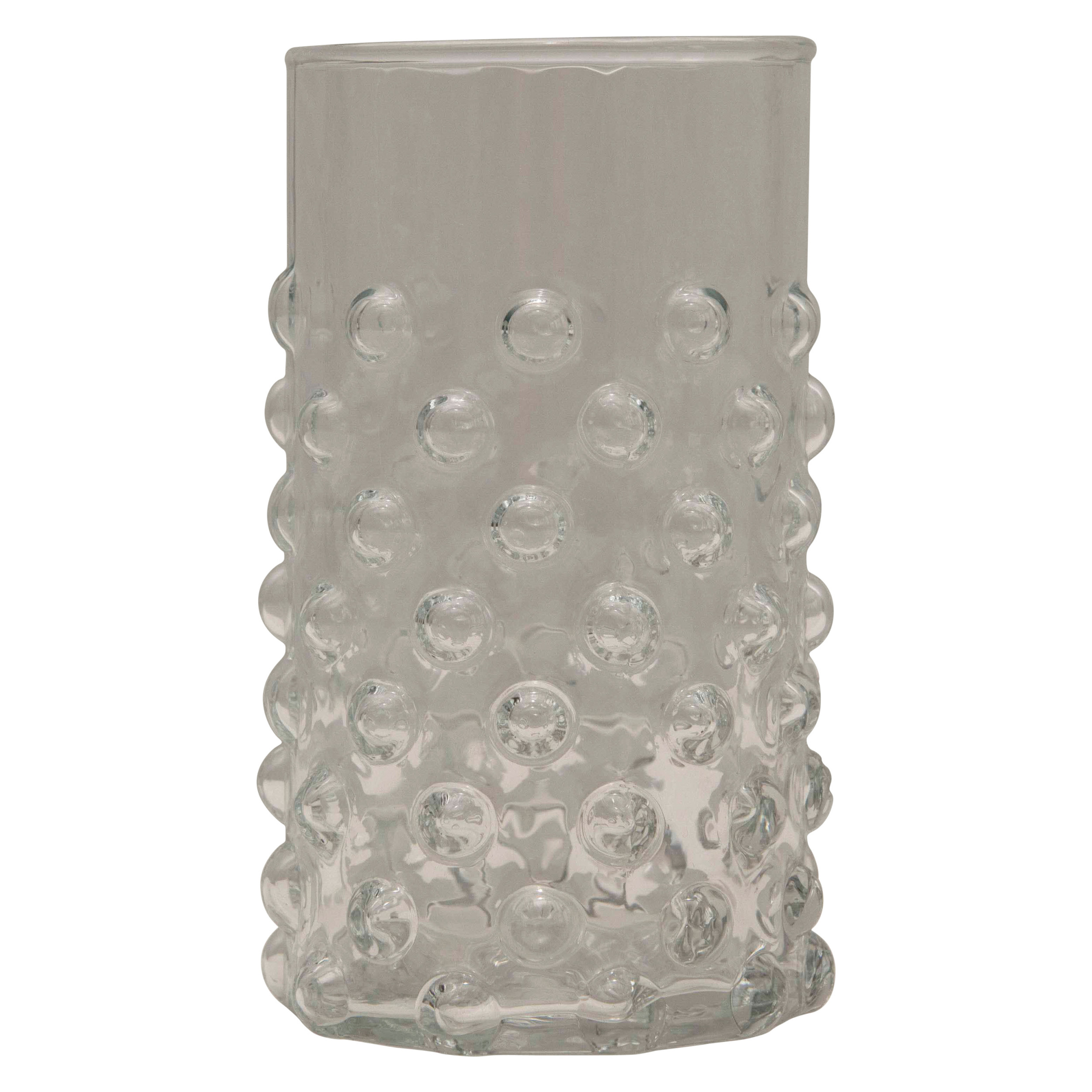 The large hobnail design on this clear drinking glass essentially creates a group of elegant polka dots. The beautiful design also gives the hand an enjoyable massage as it grabs and holds the bubbled texture. It is the perfect combination of elegance and enjoyment for the kitchen table.