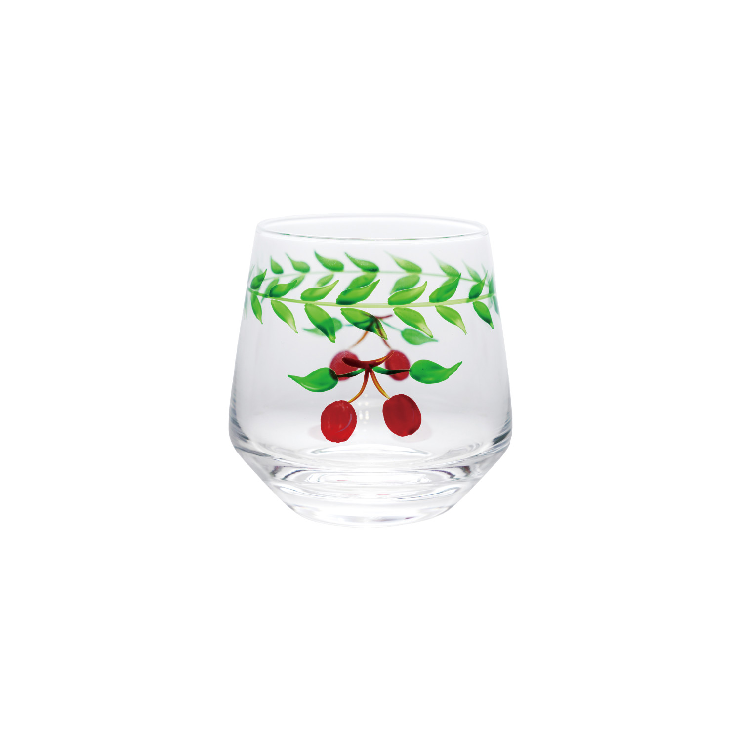 Catalog Name: 3-1/2" Round x 3-1/2"H 12 oz. Hand-Painted Drinking Glass w/ Cherries, Green & Red