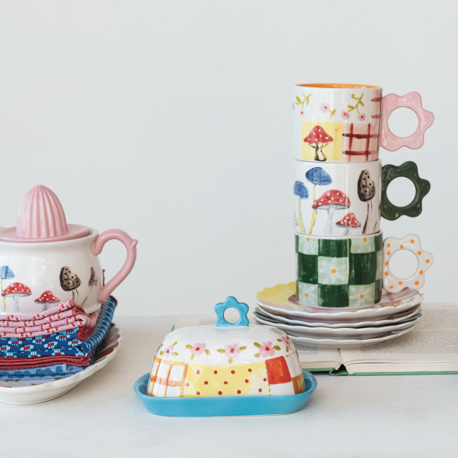Catalog Name: 6-1/2"L x 4-1/2"W x 4-1/2"H Hand-Painted Stoneware Butter Dish w/ Pattern & Flower Shaped Handle, Multi Color