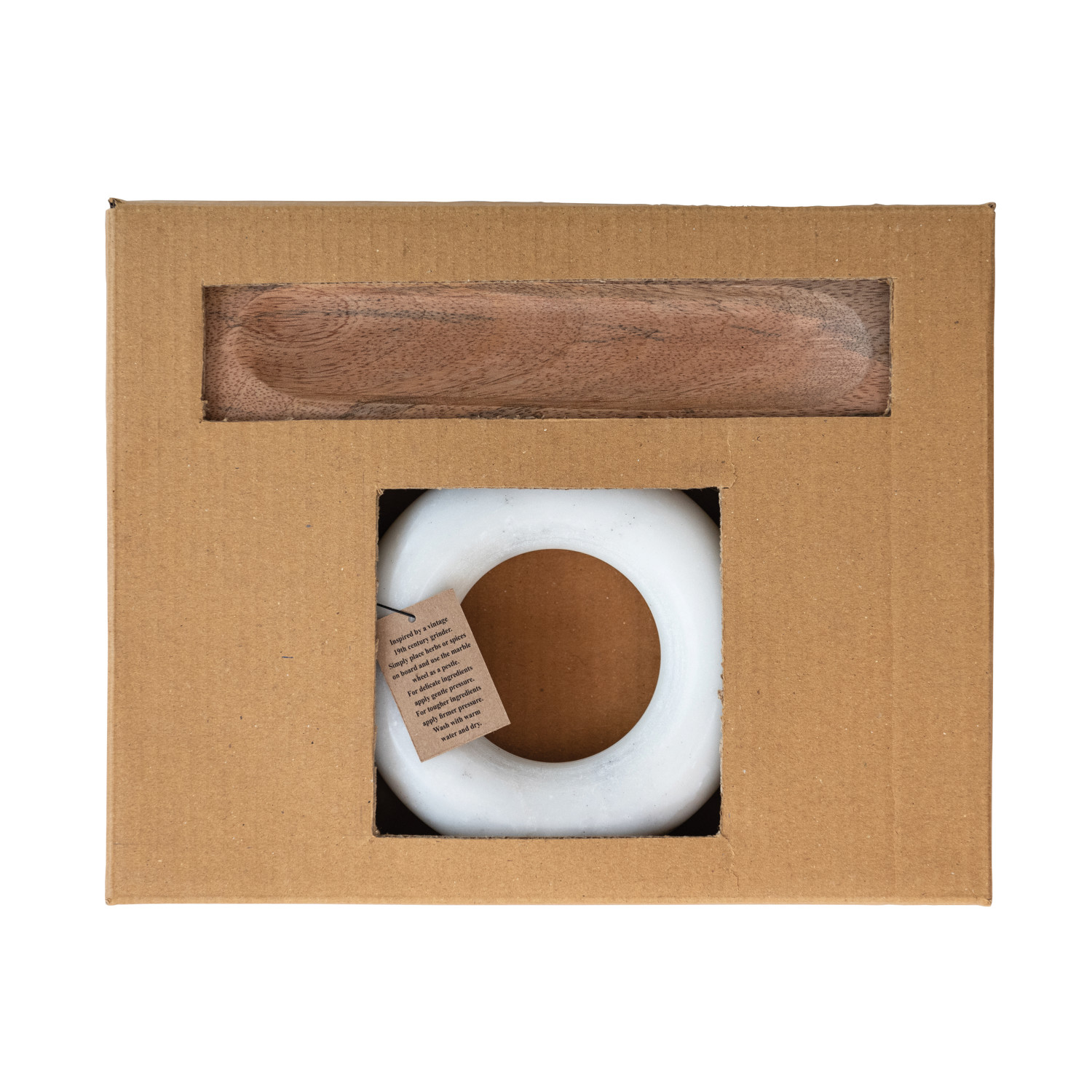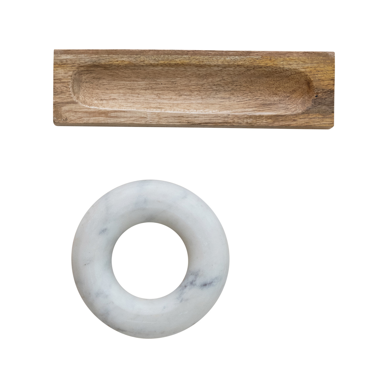 Catalog Name: 11"L x 2-3/4"W x 2"H Mango Wood Mortar w/ 6" Round Marble Ring Shaped Pestle, Natural & White, Boxed Set of 2
