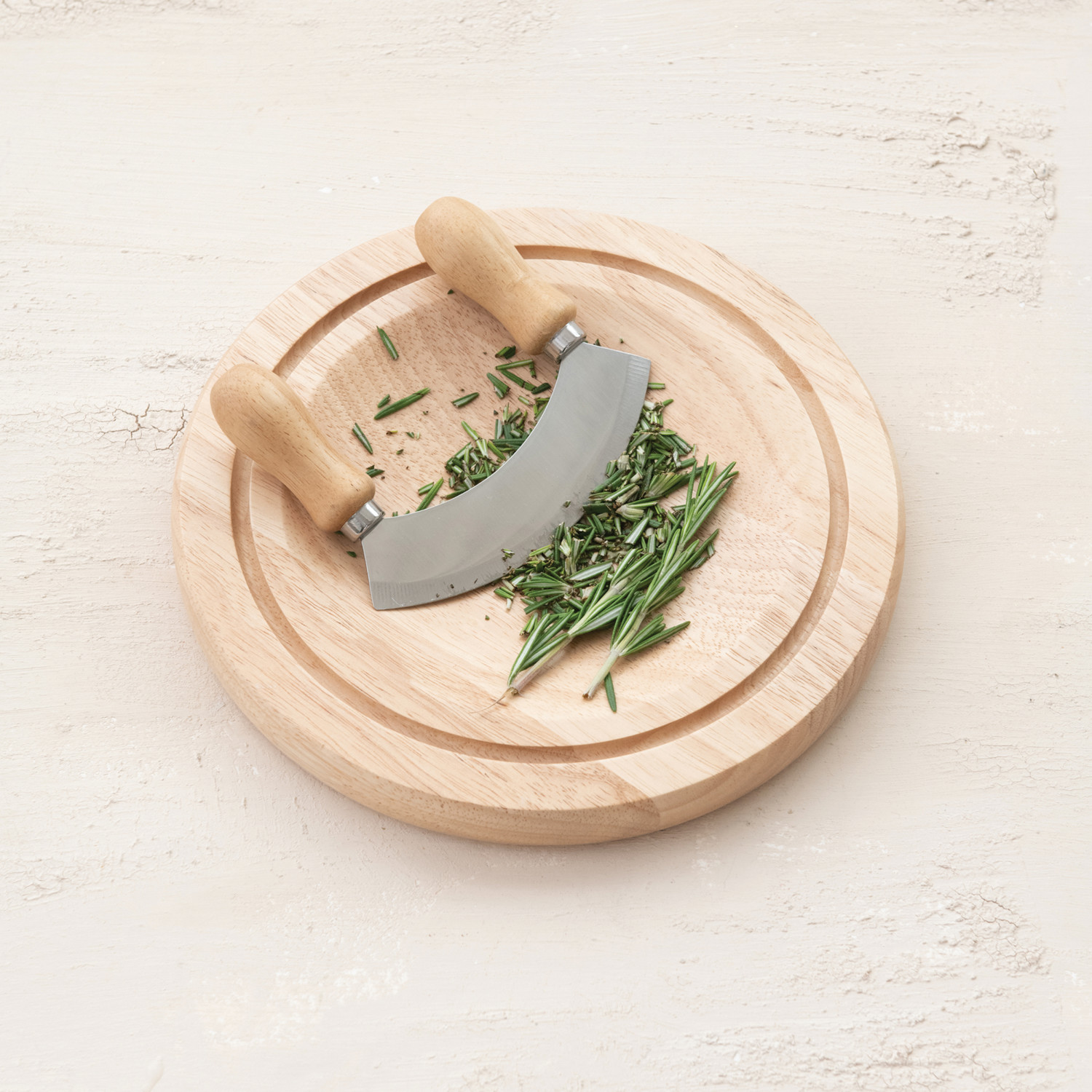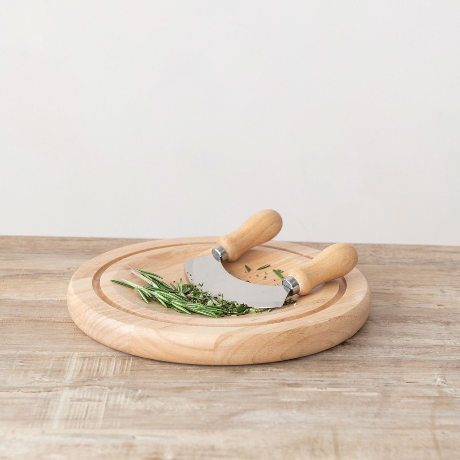 Rubberwood Herb Cutting Board w/ Stainless Steel Mezzaluna & Inset, Set of 2