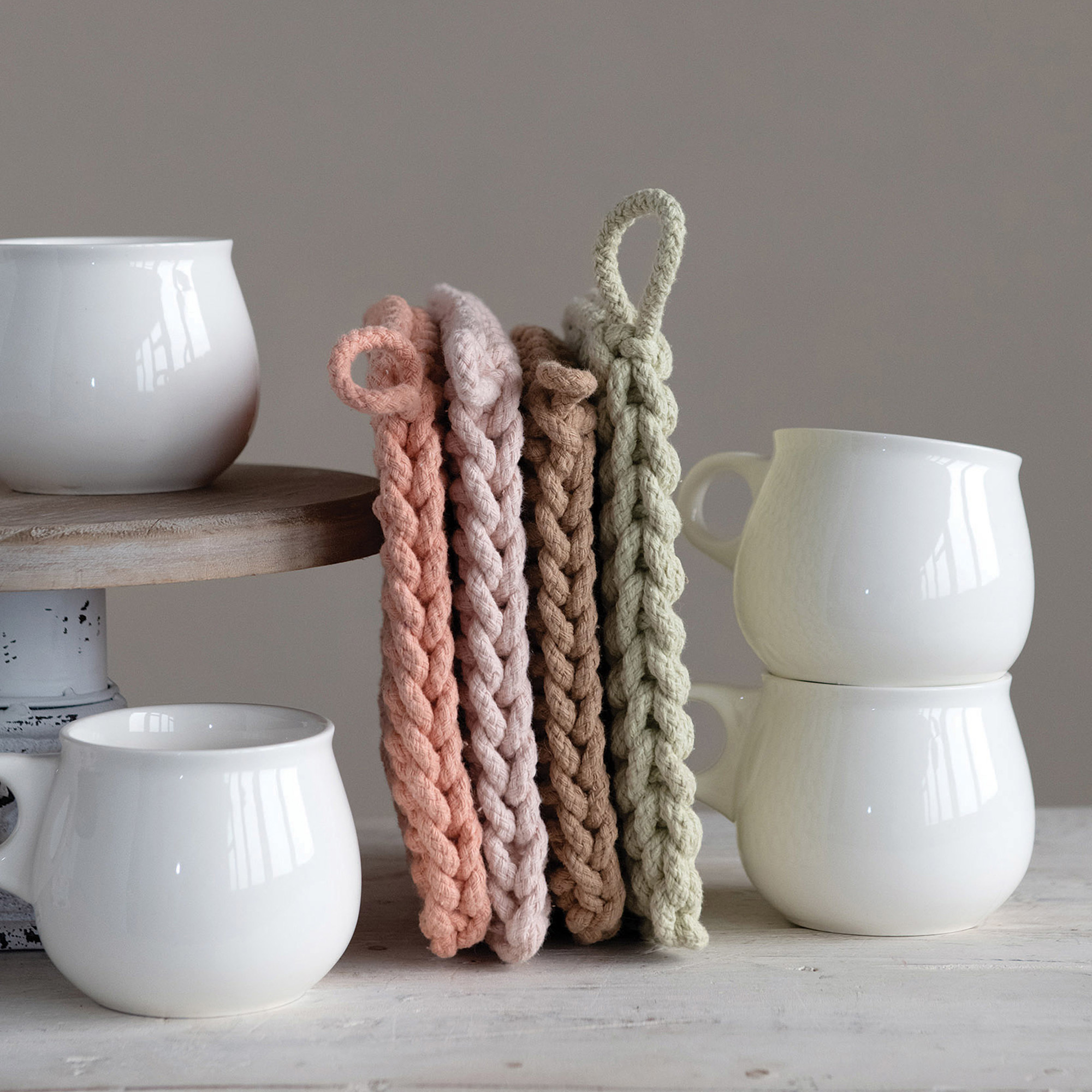 These delightful and pleasing cotton crocheted potholders will be the perfect addition to your kitchen essentials. They will be a charming accessory for any kitchen that will surely come in handy for all cooking and baking needs. Hang as a colorful wall decor or place stacked on cookbooks for everyday use and enjoyment. Comes in 4 colors.