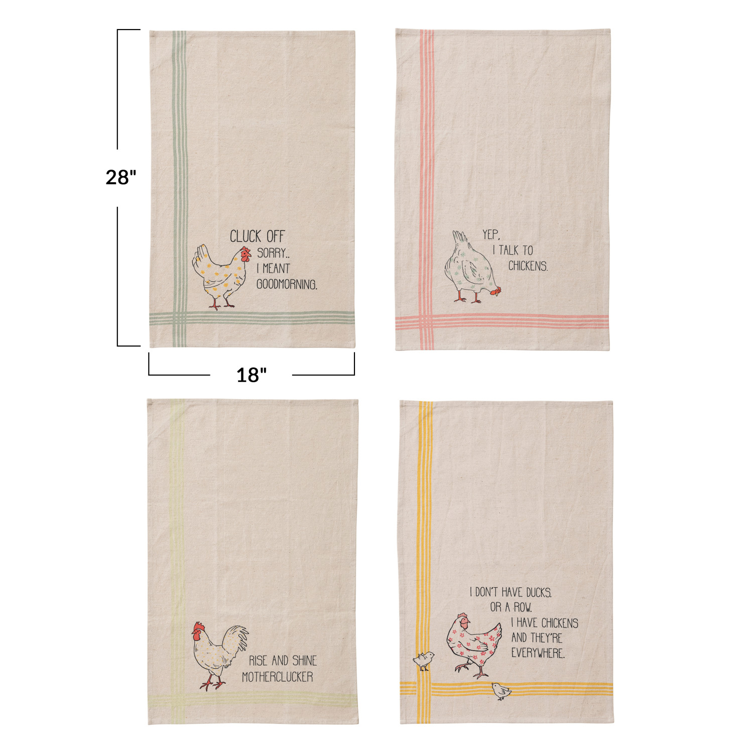 Catalog Name: 28"L x 18"W Cotton & Linen Printed Tea Towel w/ Chicken & Saying, Multi Color, 4 Styles