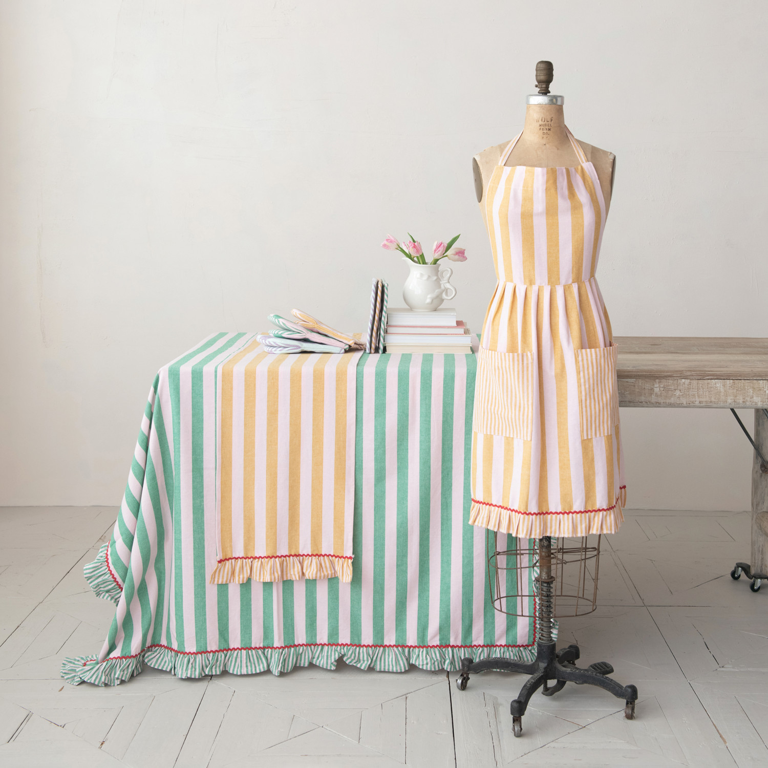 Woven Cotton Striped Table Runner w/ Ruffle & Ric Rac Trim
