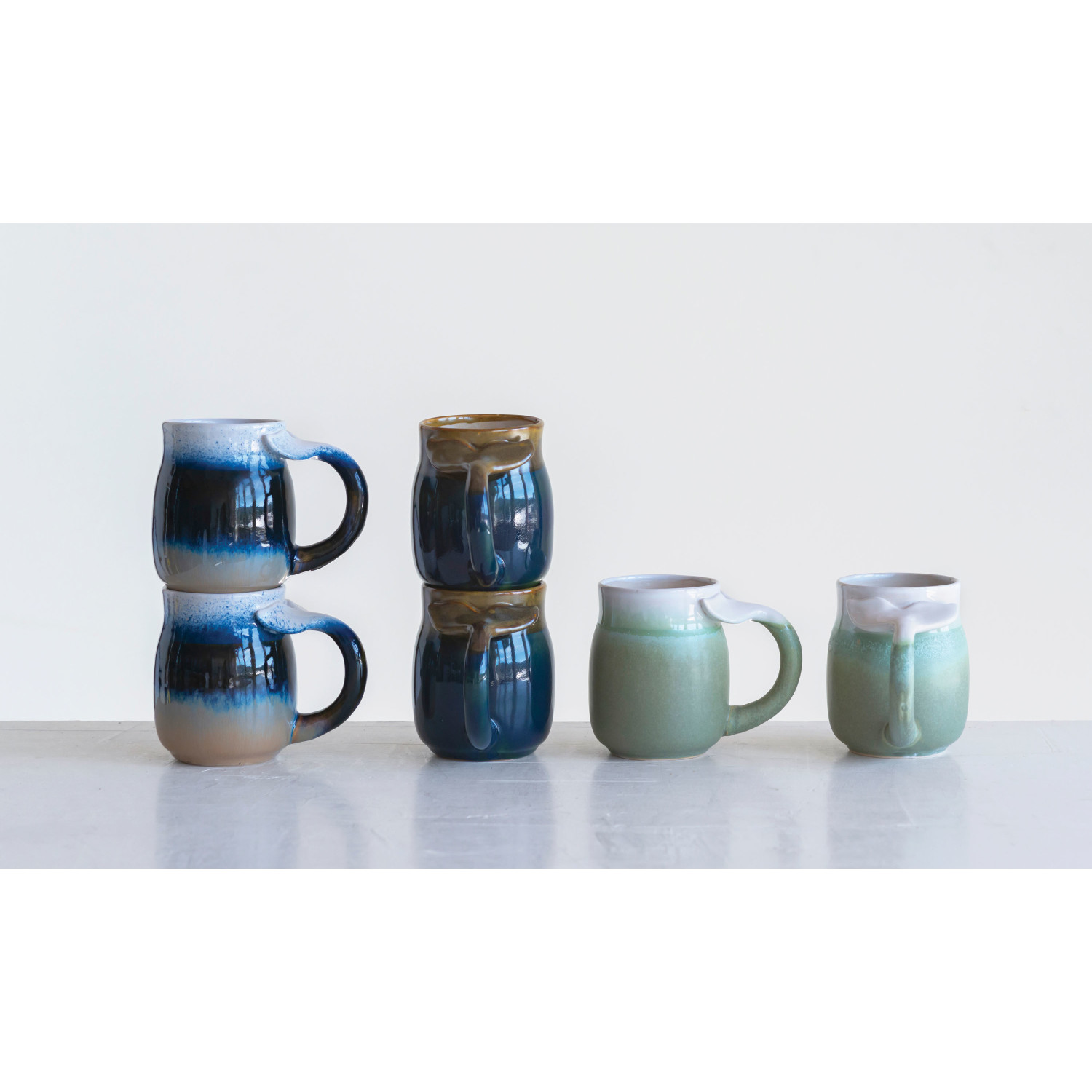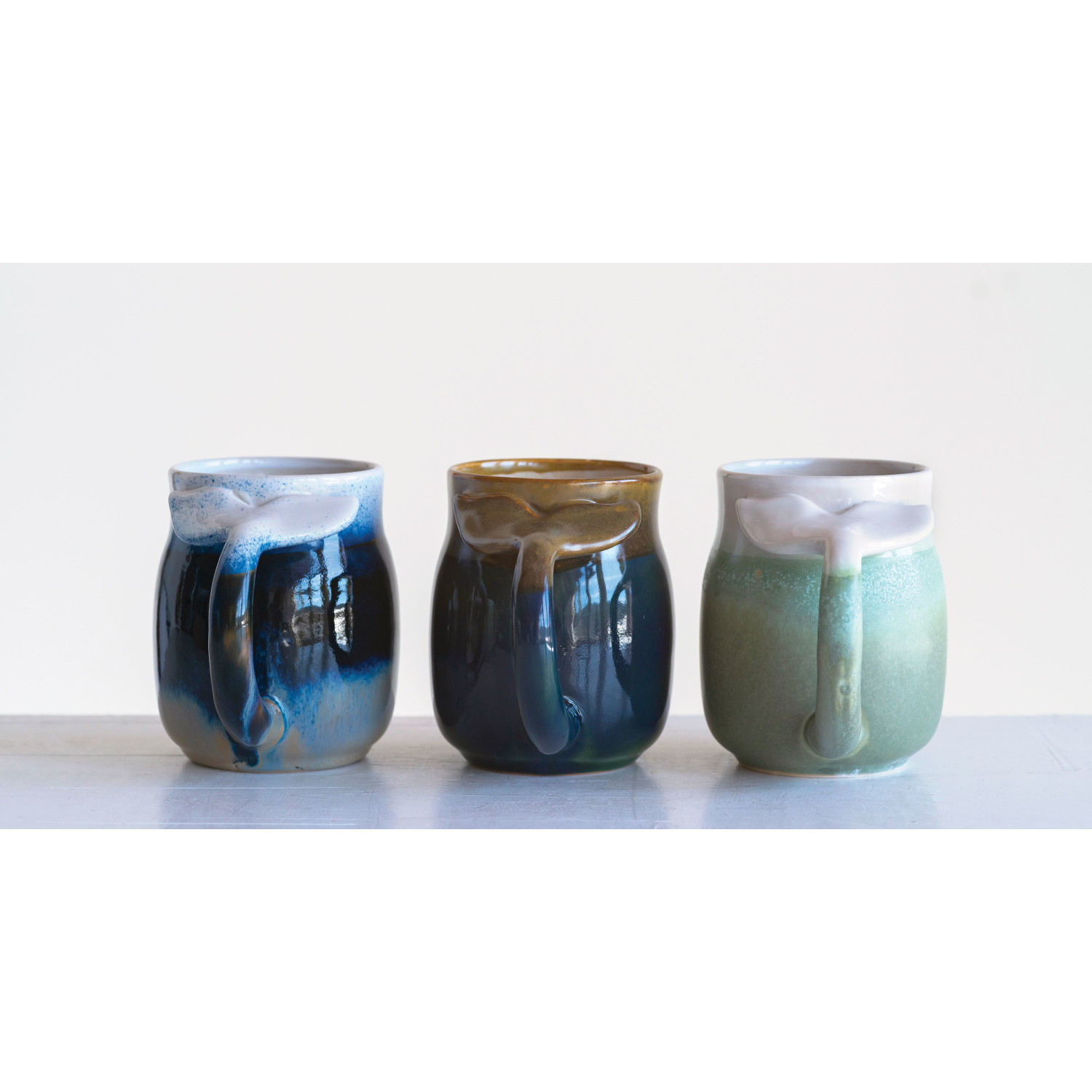 Catalog Name: 3-3/4" Round x 4-1/2"H 16 oz. Stoneware Mug w/ Whale Tail Handle, Reactive Glaze, 3 Colors (Each One Will Vary)