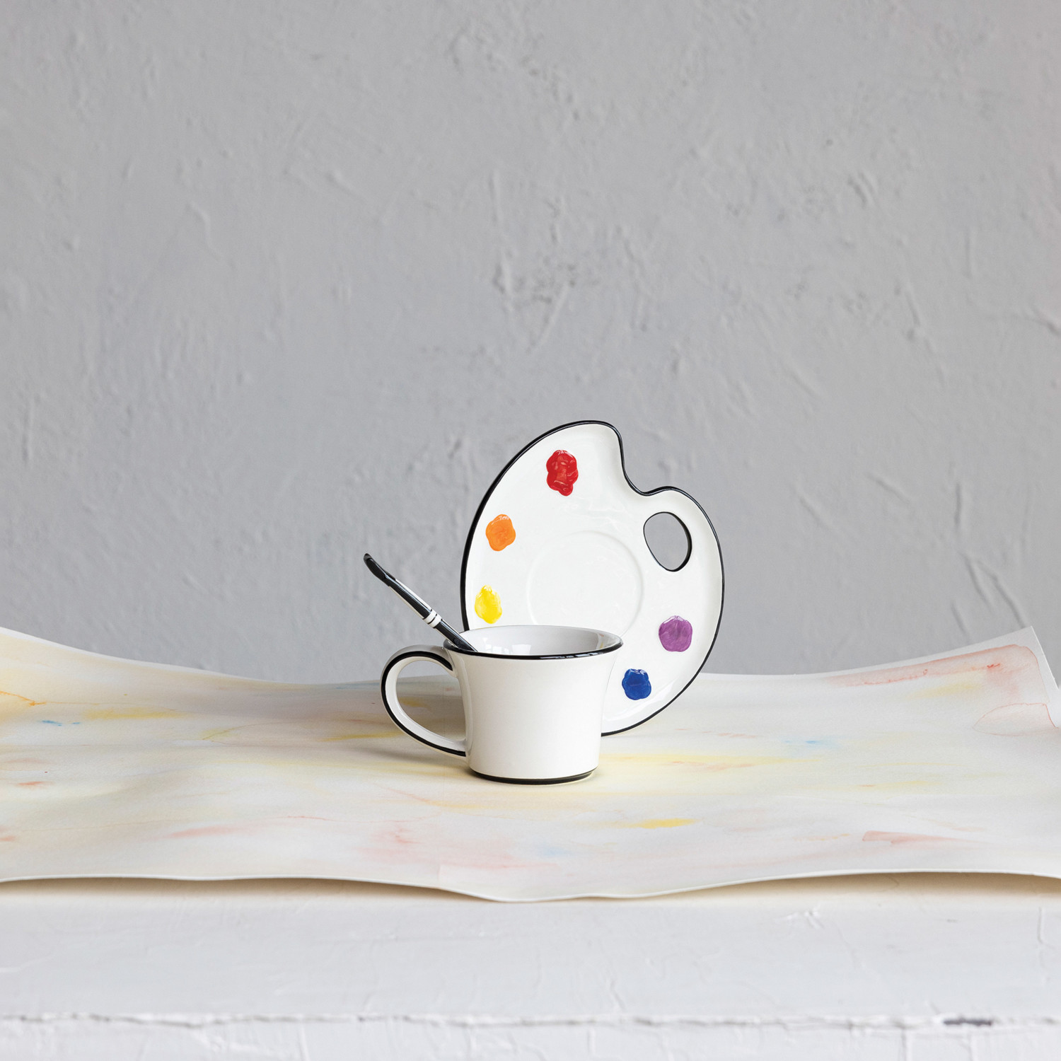 Catalog Name: 6-1/4"L x 5-3/4"W x 4-1/2"H Ceramic Paint Palette Saucer w/ Teacup & Brush Shaped Stirrer, Multi Color, Set of 3