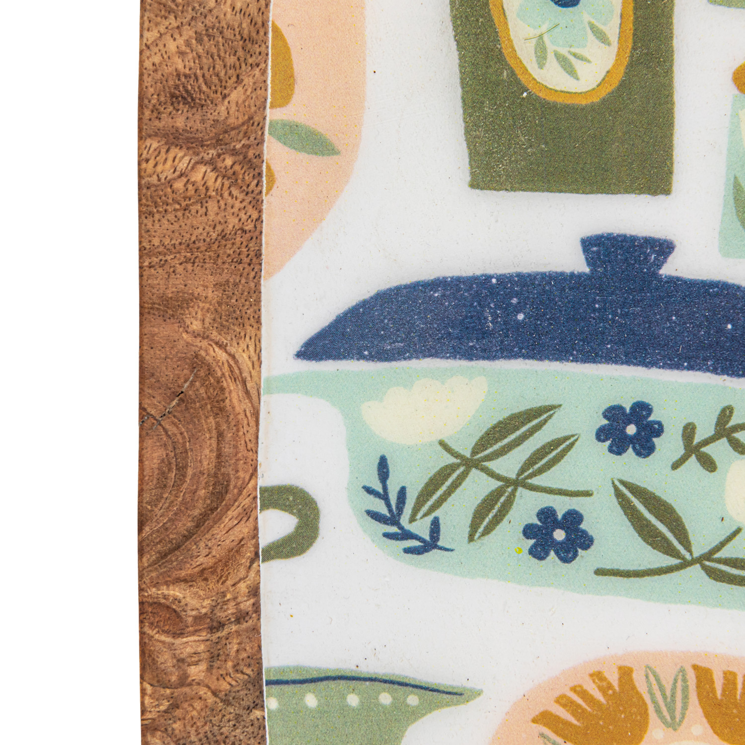 This enameled mango wood trays with kitchenware pattern set is a delightful and functional serveware piece that can brighten up any dining or living space. The set includes three square trays of different sizes, each featuring a kitchenware pattern with fruit and the words "Bon Appetit" on a colorful enamel background. The kitchenware pattern adds a touch of whimsy and creativity, while the enamel creates a contrast with the natural wood grain. The trays are made of mango wood that is eco-friendly and unique, as each tray is handcrafted by skilled artisans. The trays are also enameled with a glossy finish that makes them durable and easy to clean. The trays can be used as trays to serve food such as cheese, bread, fruits, or desserts, or as platters to display items such as candles, plants, or ornaments. The trays can also be hung on the wall as a decor piece that adds some personality and fun to any room. The trays measure 10 inches, 8 inches, and 6.25 inches in length and width. They are a perfect choice for anyone who loves farmhouse, cottagecore, or cabin style.