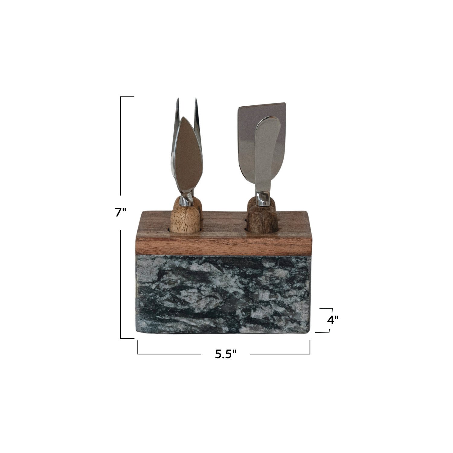 Catalog Name: 5-1/2"L x 4"W x 7"H Stainless Steel Cheese Servers w/ Mango Wood Handles & Marble & Mango Wood Stand, Black Melange & Natural, Set of 5 (Each One Will Vary)