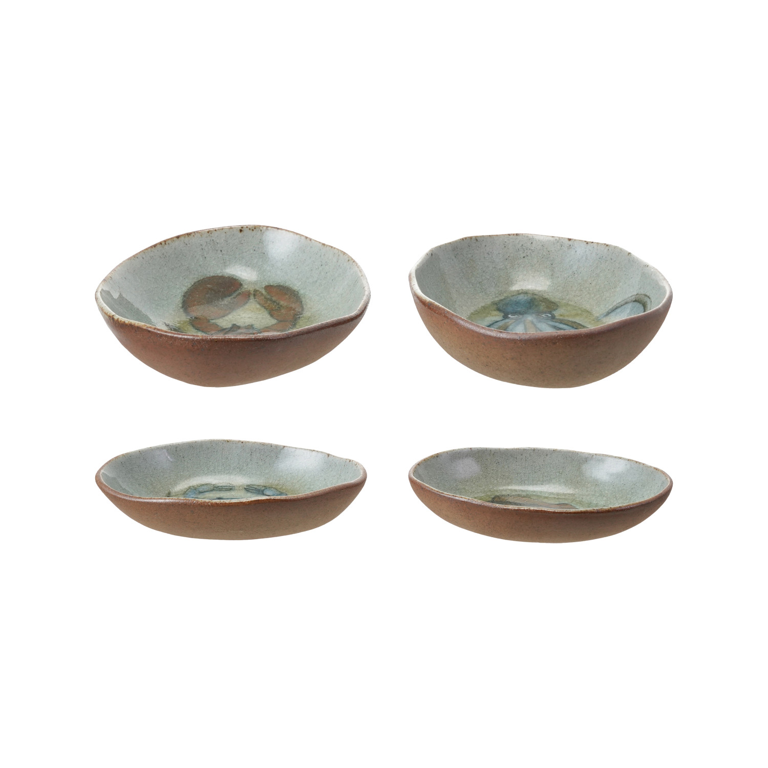 Catalog Name: 7-1/2"L x 4-3/4"W Hand-Painted Stoneware Dish w/ Sea Life, Reactive Crackle Glaze, Multi Color, 4 Styles (Each One Will Vary)