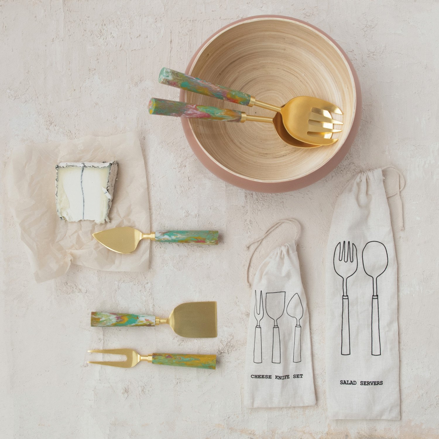 Catalog Name: 7"L Stainless Steel Cheese Knives w/ Marbled Resin Handles, Gold Finish & Multi Color, Set of 3 in Printed Drawstring Bag (Each One Will Vary)