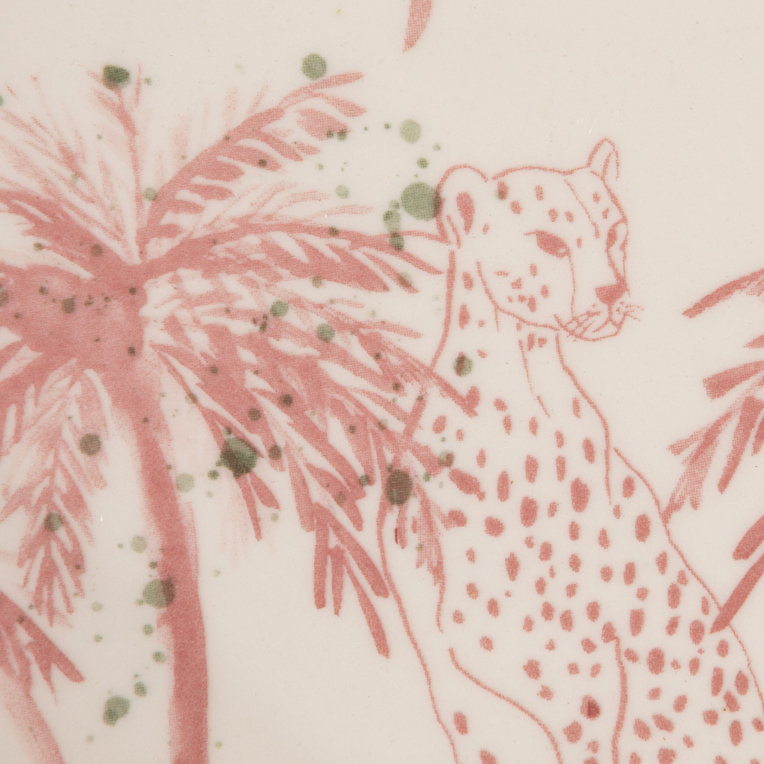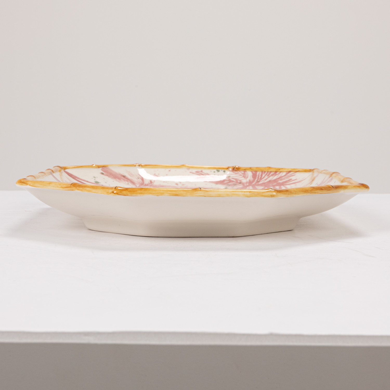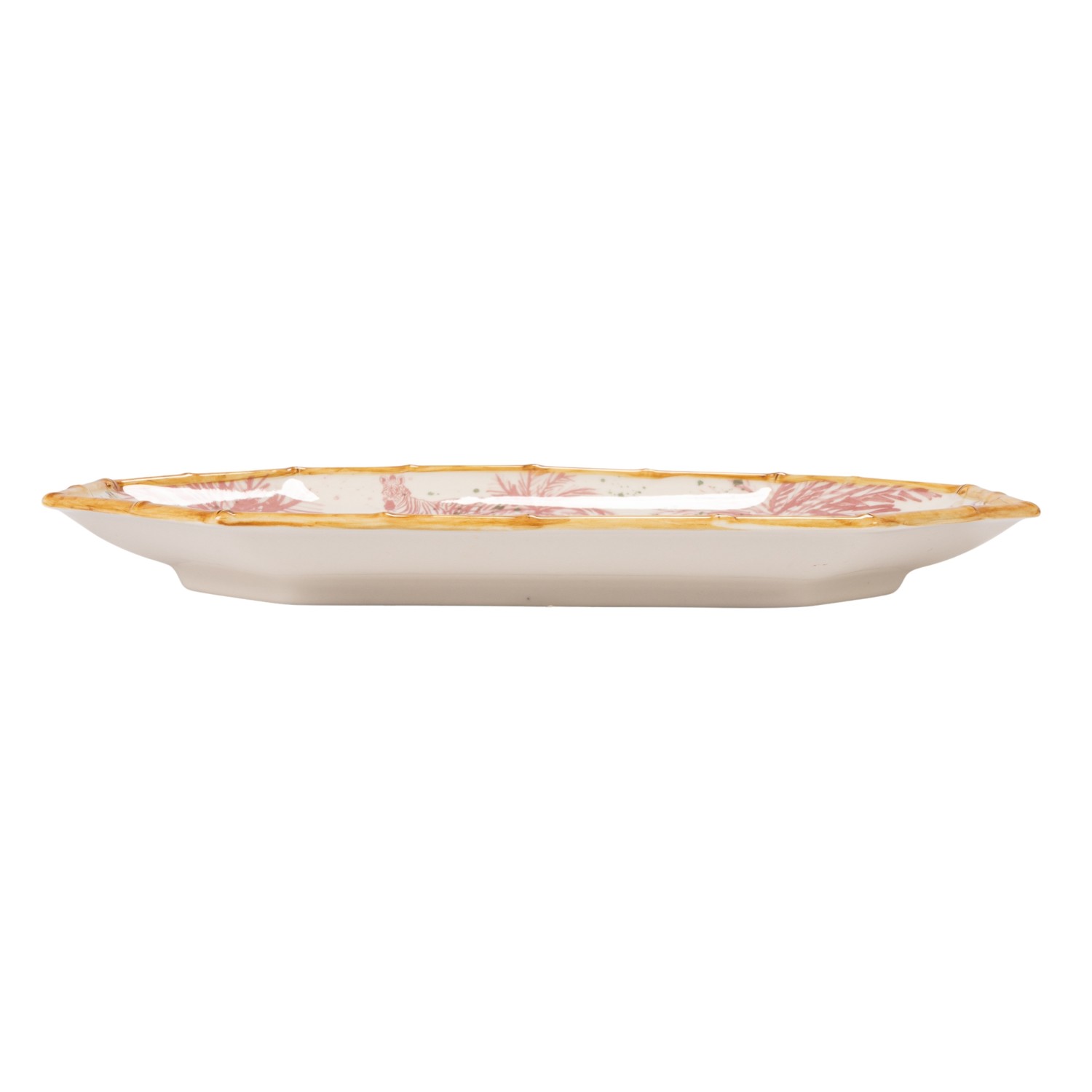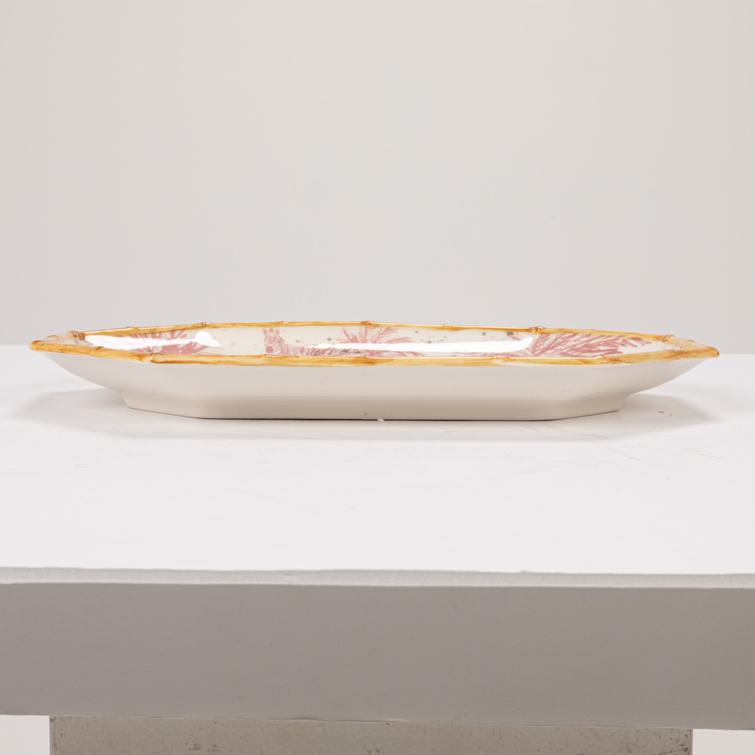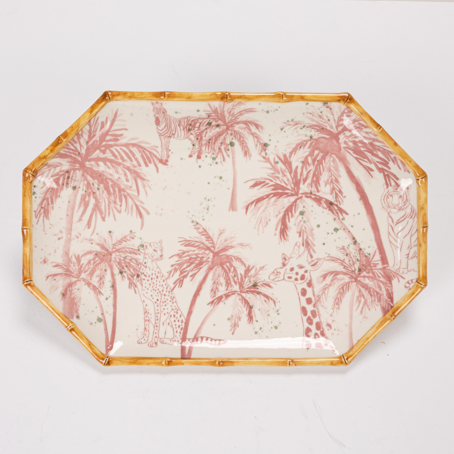 Catalog Name: 14"L x 9-1/2"W Hand-Painted Stoneware Octagon Shaped Platter w/ Palm Trees, Animals & Bamboo Style Edge, White, Pink & Tan Color
