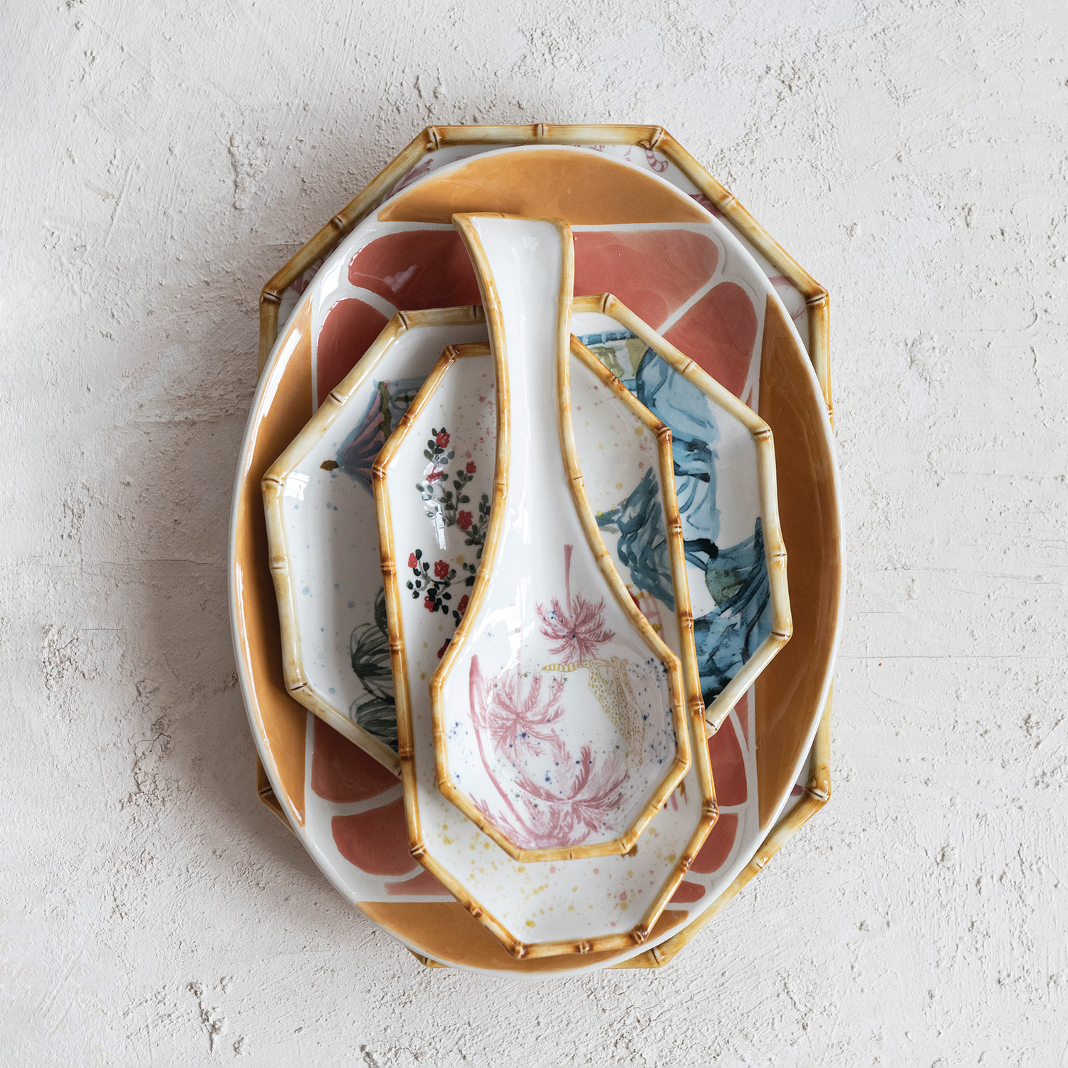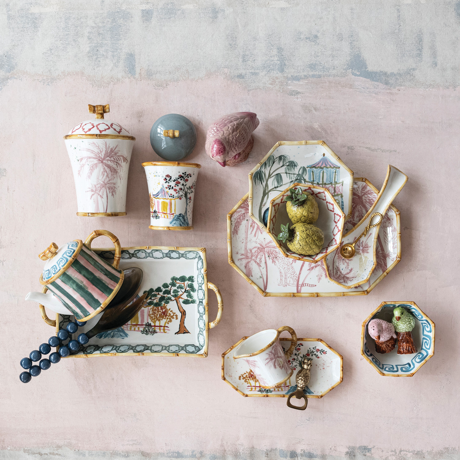 Hand-Painted Stoneware Octagon Shaped Platter with Palm Trees, Animals & Bamboo Style Edge
