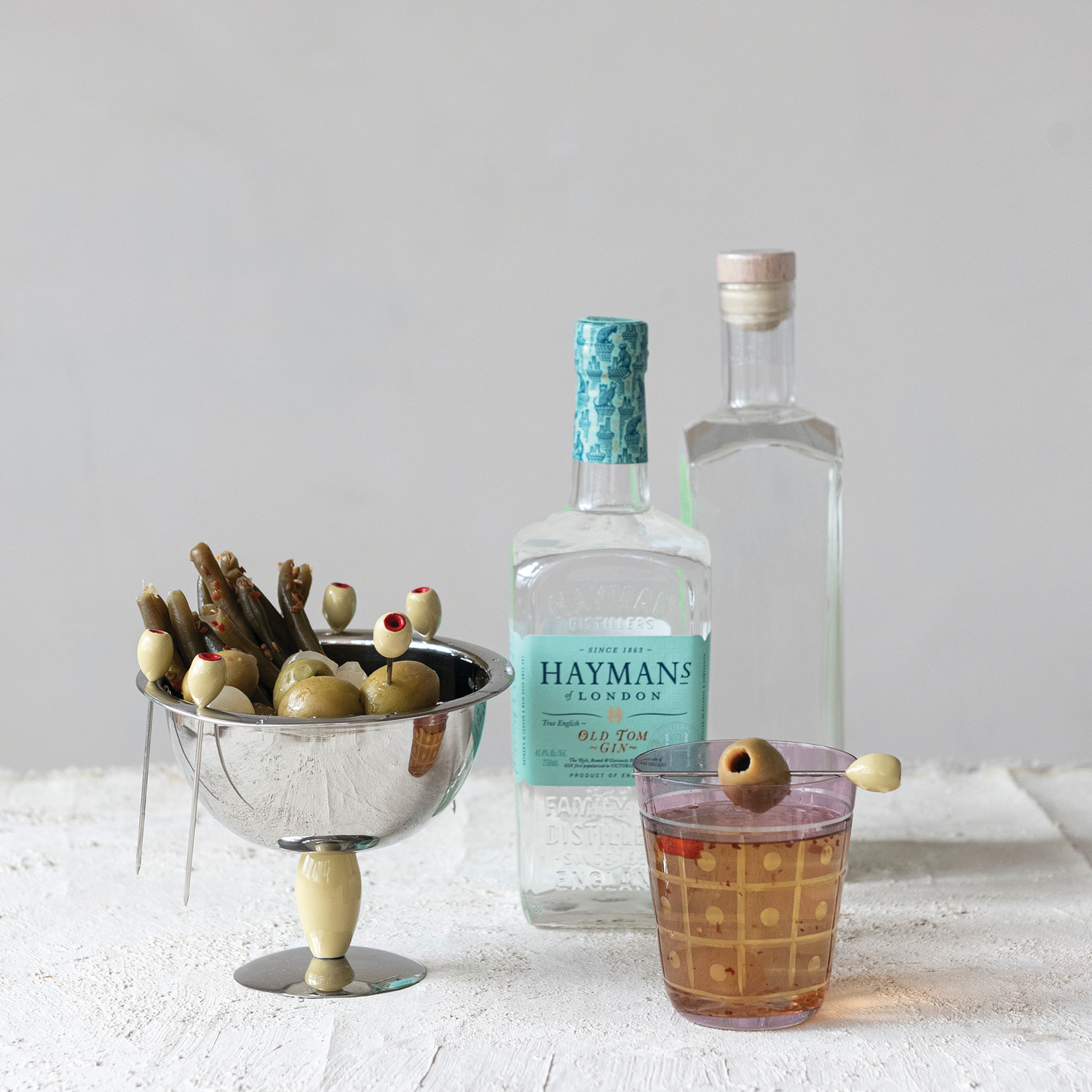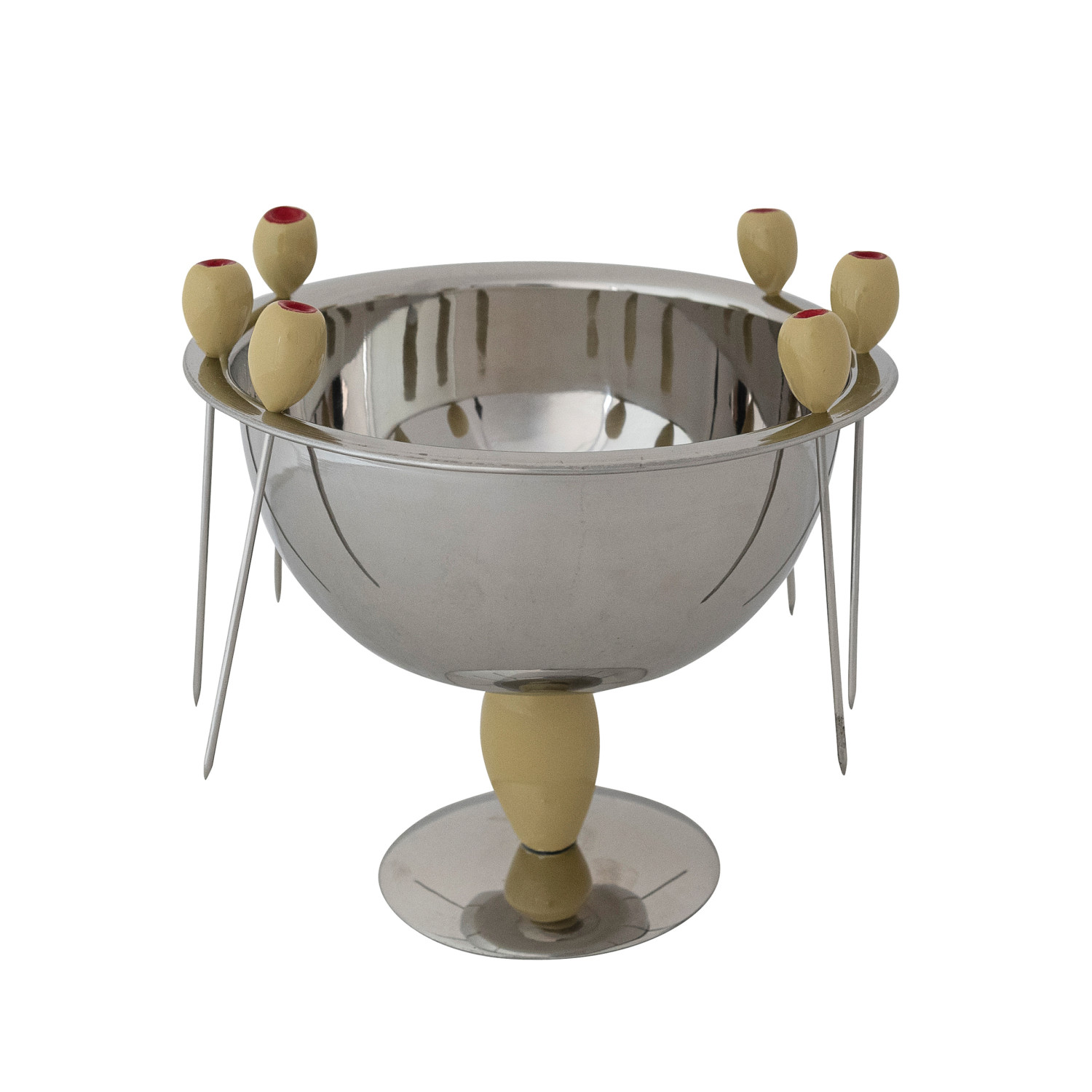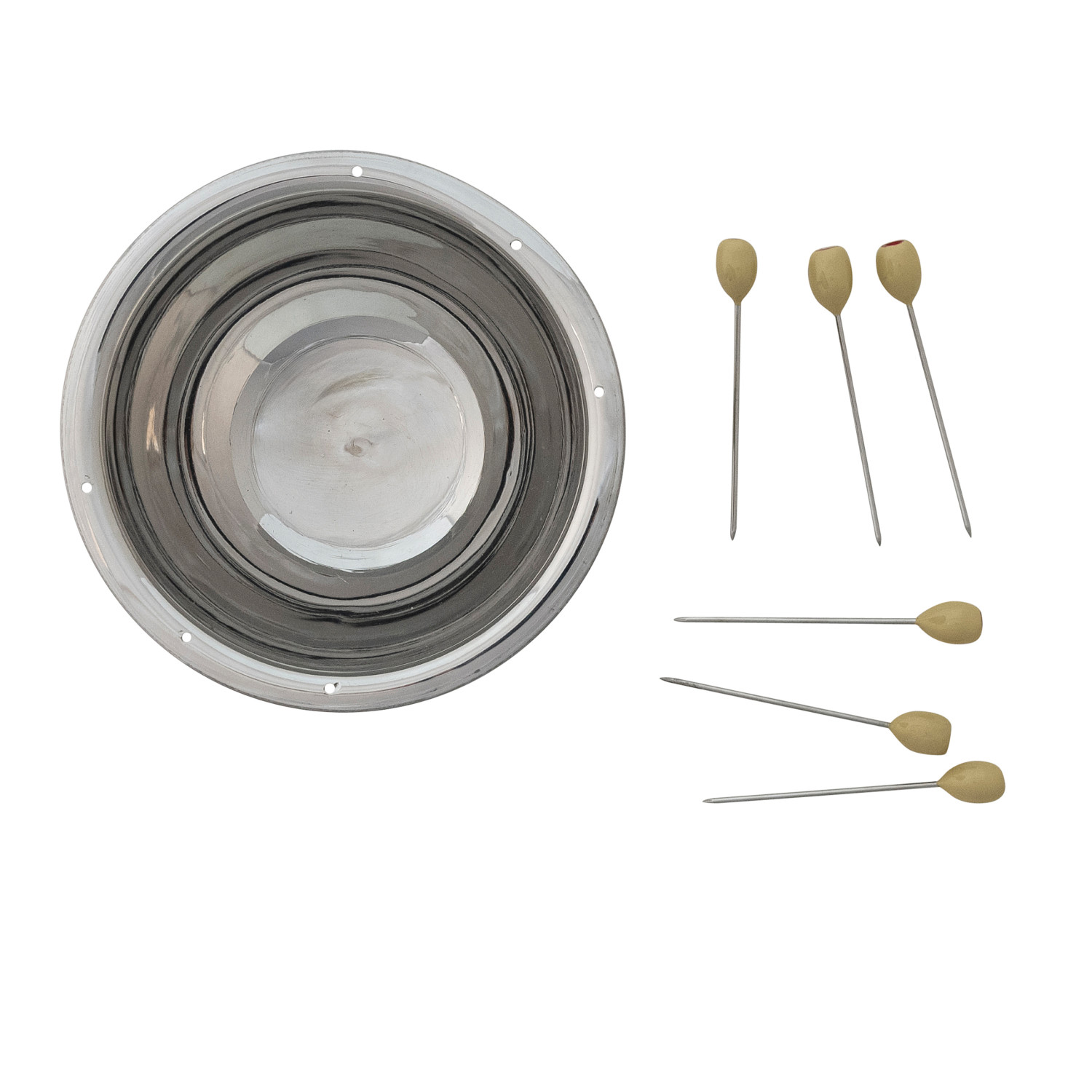 Enameled Stainless Steel Footed Bowl with (6) Olive Shaped Appetizer Picks on Rim, Set of 7