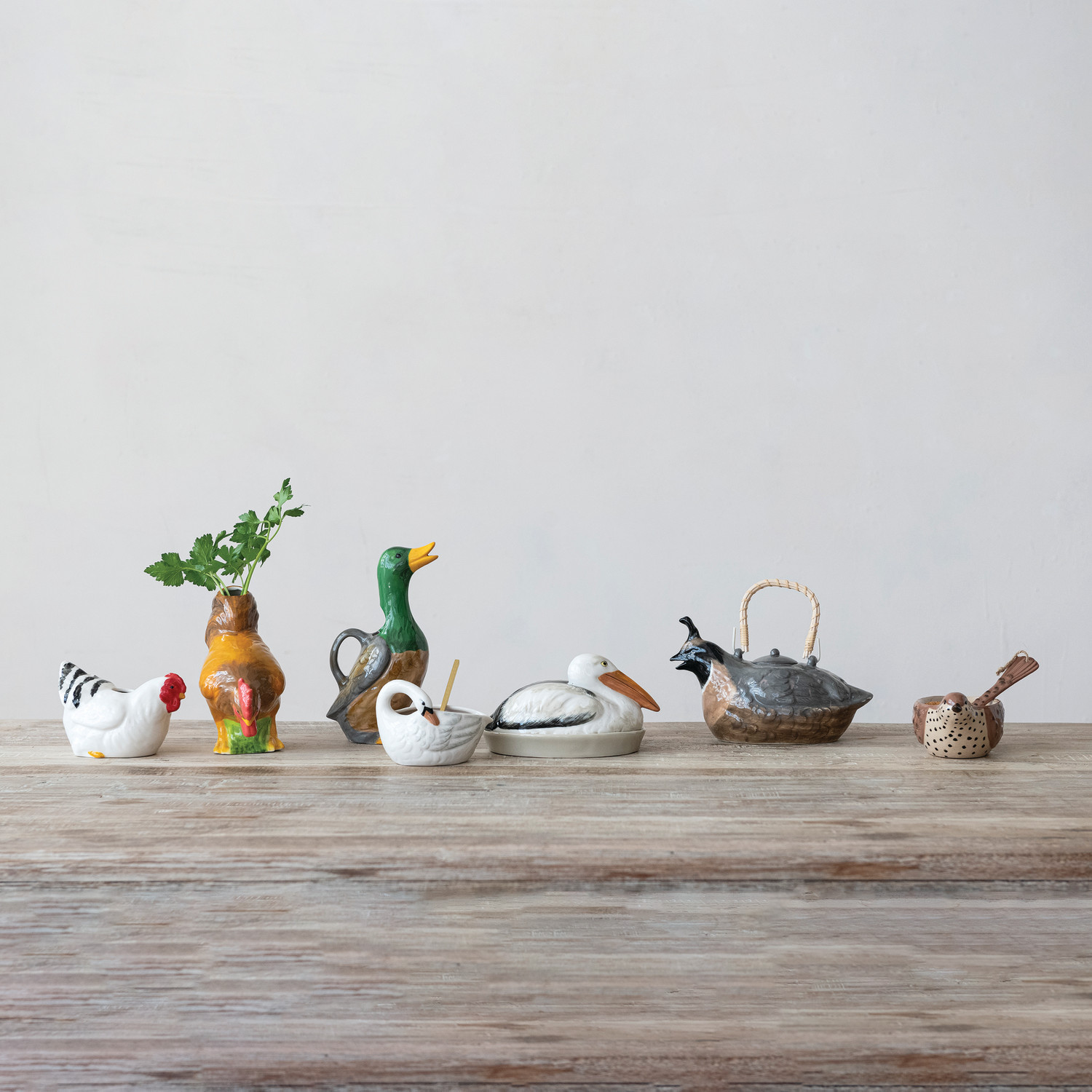 Catalog Name: 8-3/4"L x 4-1/2"W x 5-1/4"H 24 oz. Hand-Painted Stoneware Quail Shaped Teapot w/ Rattan Wrapped Handle, Multi Color