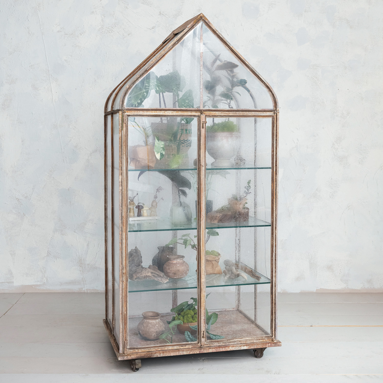 This Metal and Acrylic Terrarium, standing tall on caster wheels, is a beautifully distressed piece that brings a touch of vintage charm to any setting. Its three glass shelves offer a combined weight capacity of 51 pounds, perfect for an array of potted greens or decorative items. The terrarium's generous size, 32.25 inches long by 24.25 inches wide by 70 inches high, makes it a versatile addition to the home. Whether placed in a sunlit corner or as a centerpiece, this terrarium on wheels is a delightful blend of form and function, ready to roll into heart and home. Each piece varies, adding to its unique character.