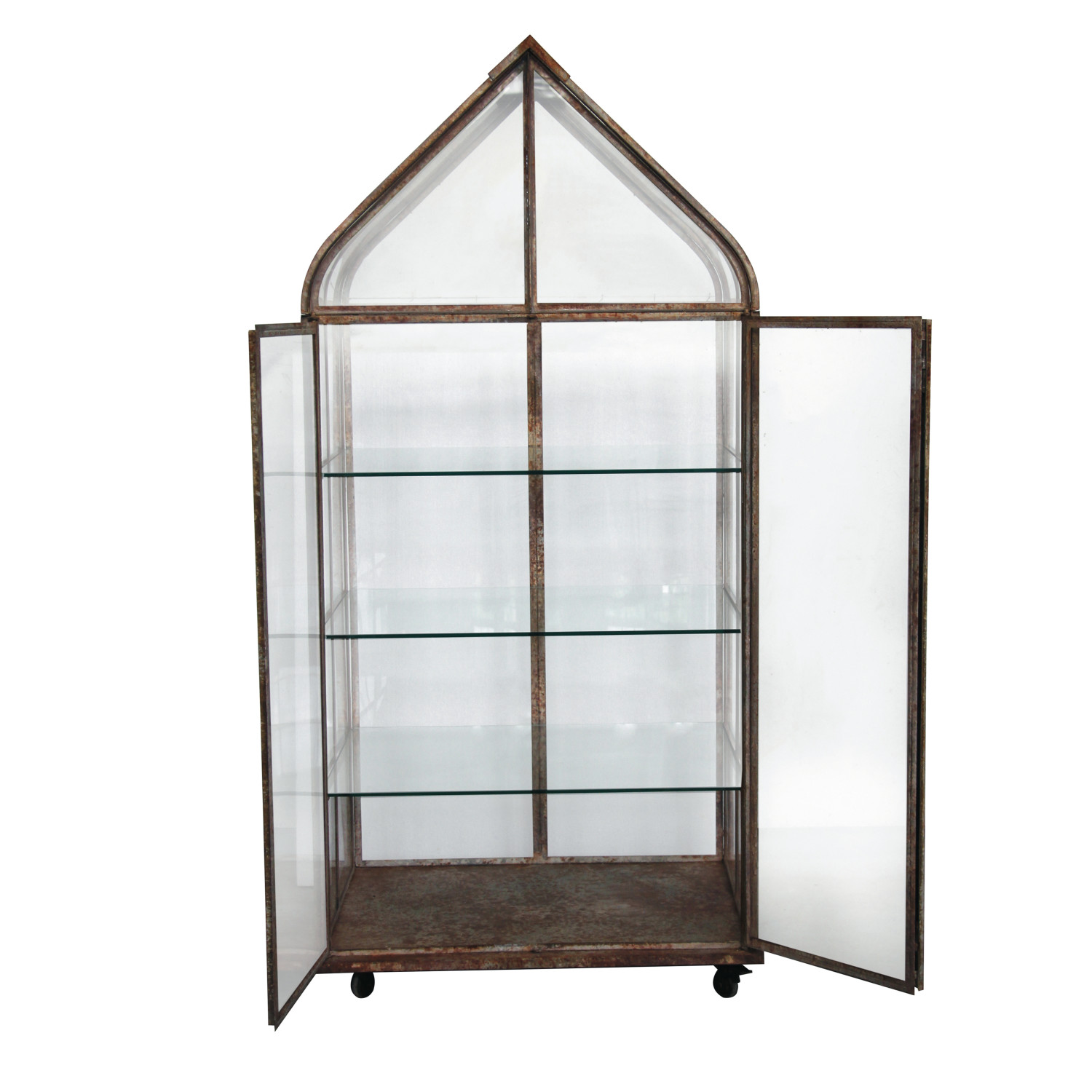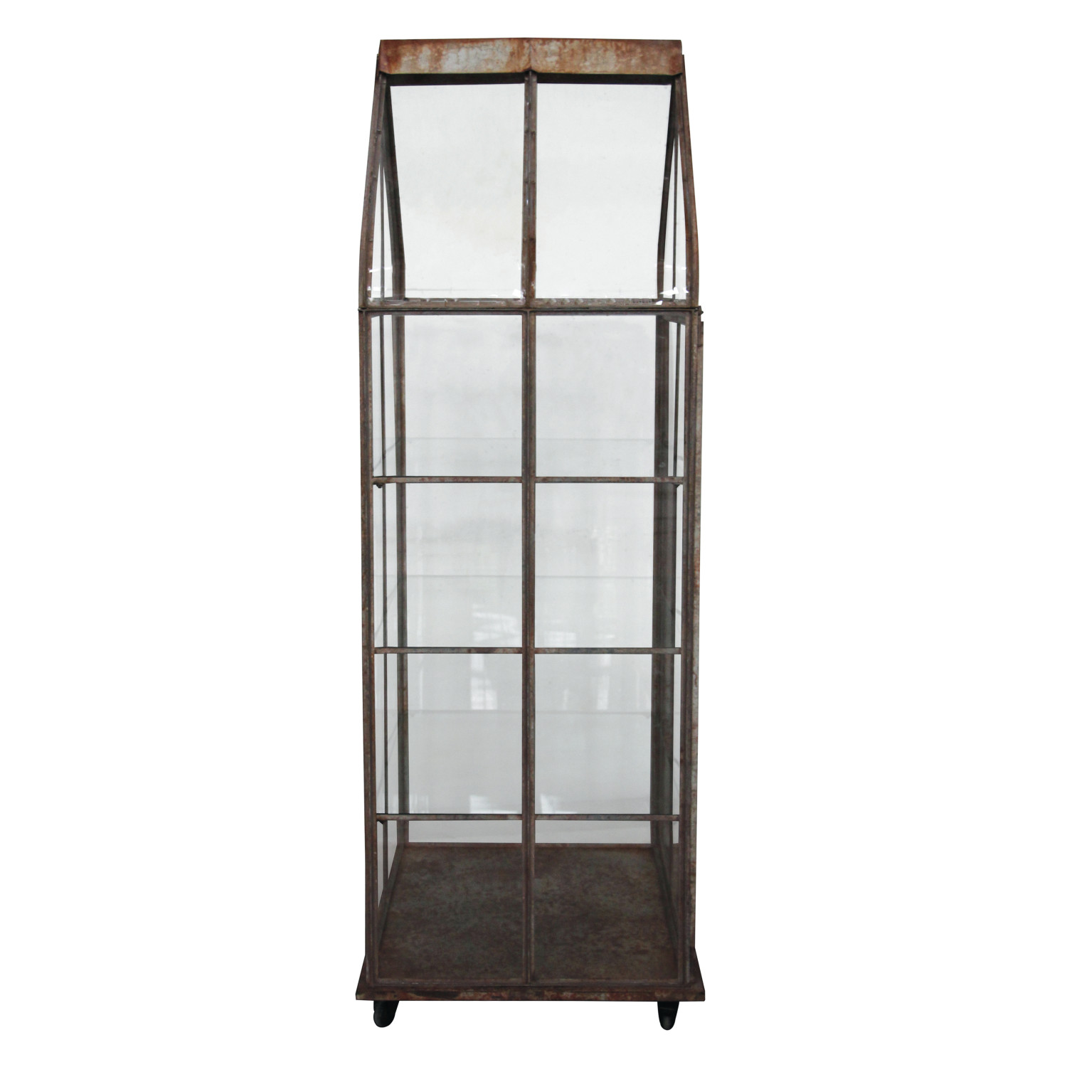 Catalog Name: 32-1/4"L x 24-1/4"W x 70"H Metal & Acrylic Terrarium on Casters w/ 3 Glass Shelves, Heavily Distressed Finish, KD, Truck Ship (Each One Will Vary)