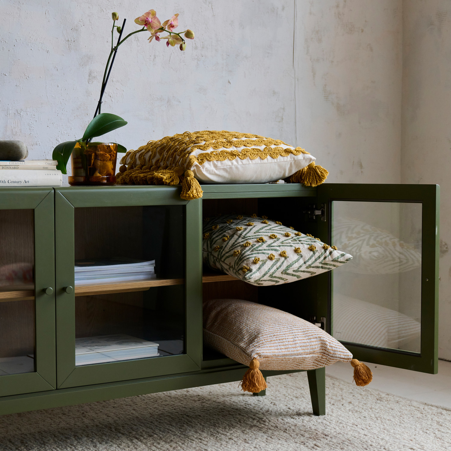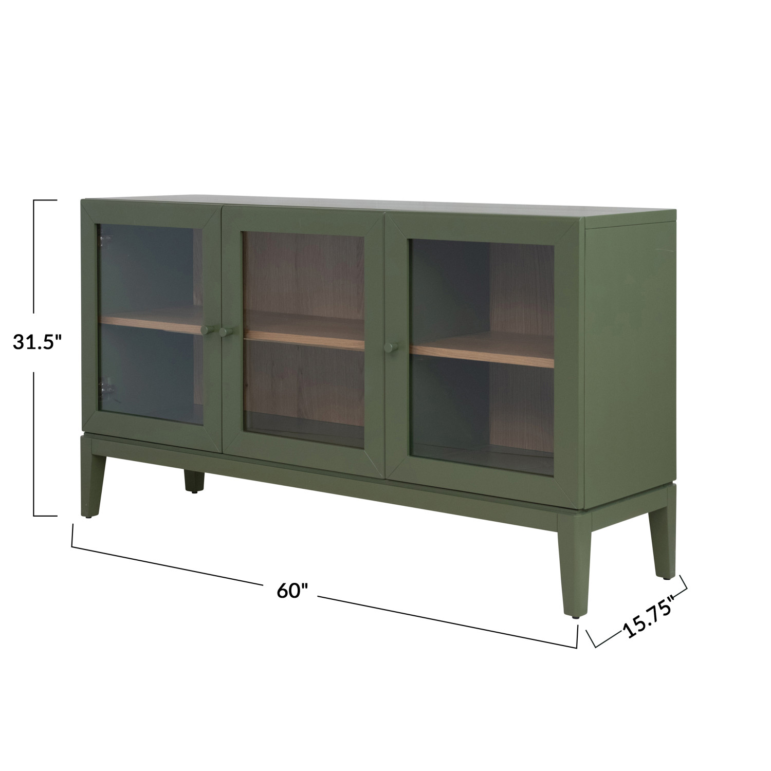 Catalog Name: 60"W x 15-3/4"D x 31-1/2"H Wood Sideboard w/ 3 Glass Doors, 2 Shelves & Oak Veneer Inside, Green & Natural, Truck Ship