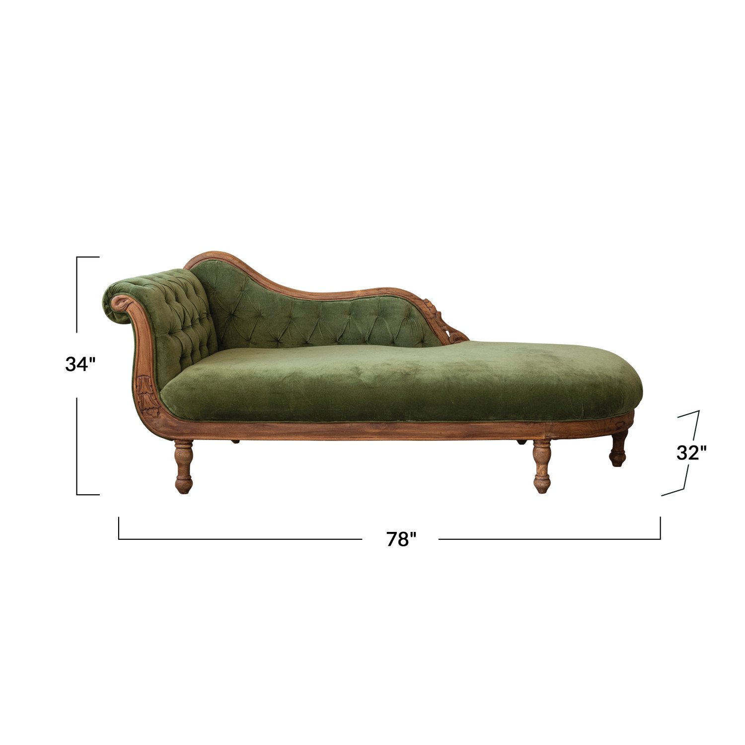 Indulge in luxury and comfort with this green velvet chaise lounge. This exquisite piece of furniture features soft cotton velvet upholstery that feels smooth and cozy to the touch. The rich green color adds a pop of vibrancy and elegance to any space. The carved wood frame showcases intricate details and a warm walnut finish that enhances the beauty and craftsmanship of this chaise lounge. Whether curling up with a good book, taking a nap, or simply relaxing, this chaise lounge offers a spacious and comfortable seat that conforms to the body. It measures 78 inches in length, 32 inches in width, and 34 inches in height. This chaise lounge is easy to assemble and durable, making it a great addition to the home.