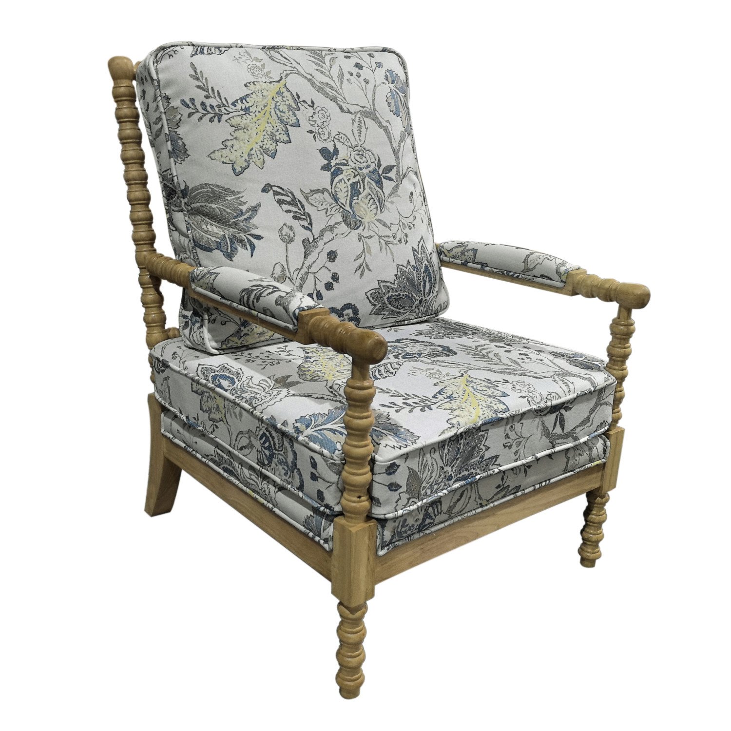 Catalog Name: 26-3/4"W x 33"D x 37-3/4"H Linen Fabric Upholstered Chair w/ Floral & Leaf Pattern & Spindle Wood Frame, Natural, Truck Ship
