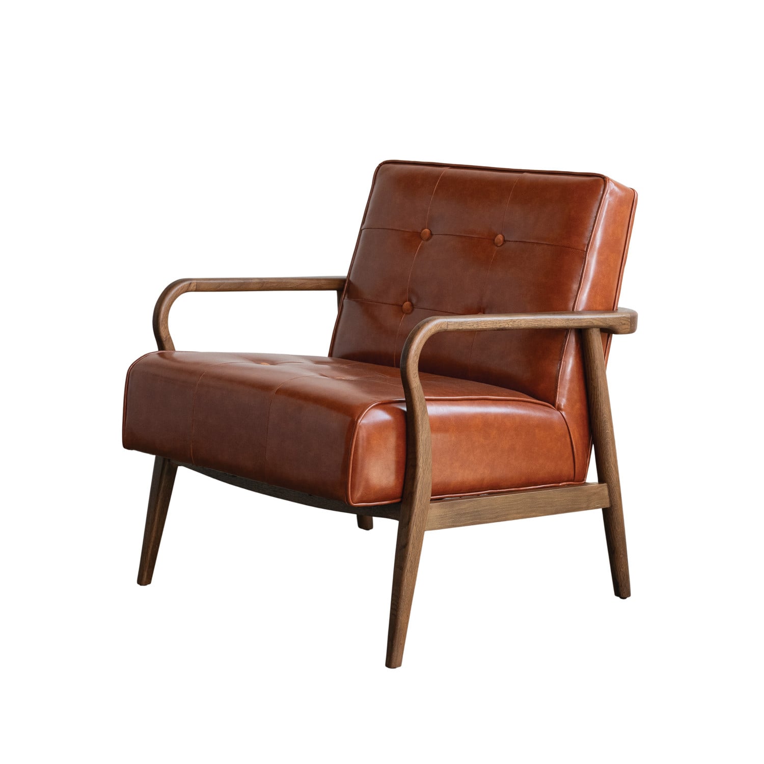 Oak Wood & Faux Leather Tufted Arm Chair, Natural & Cognac Color