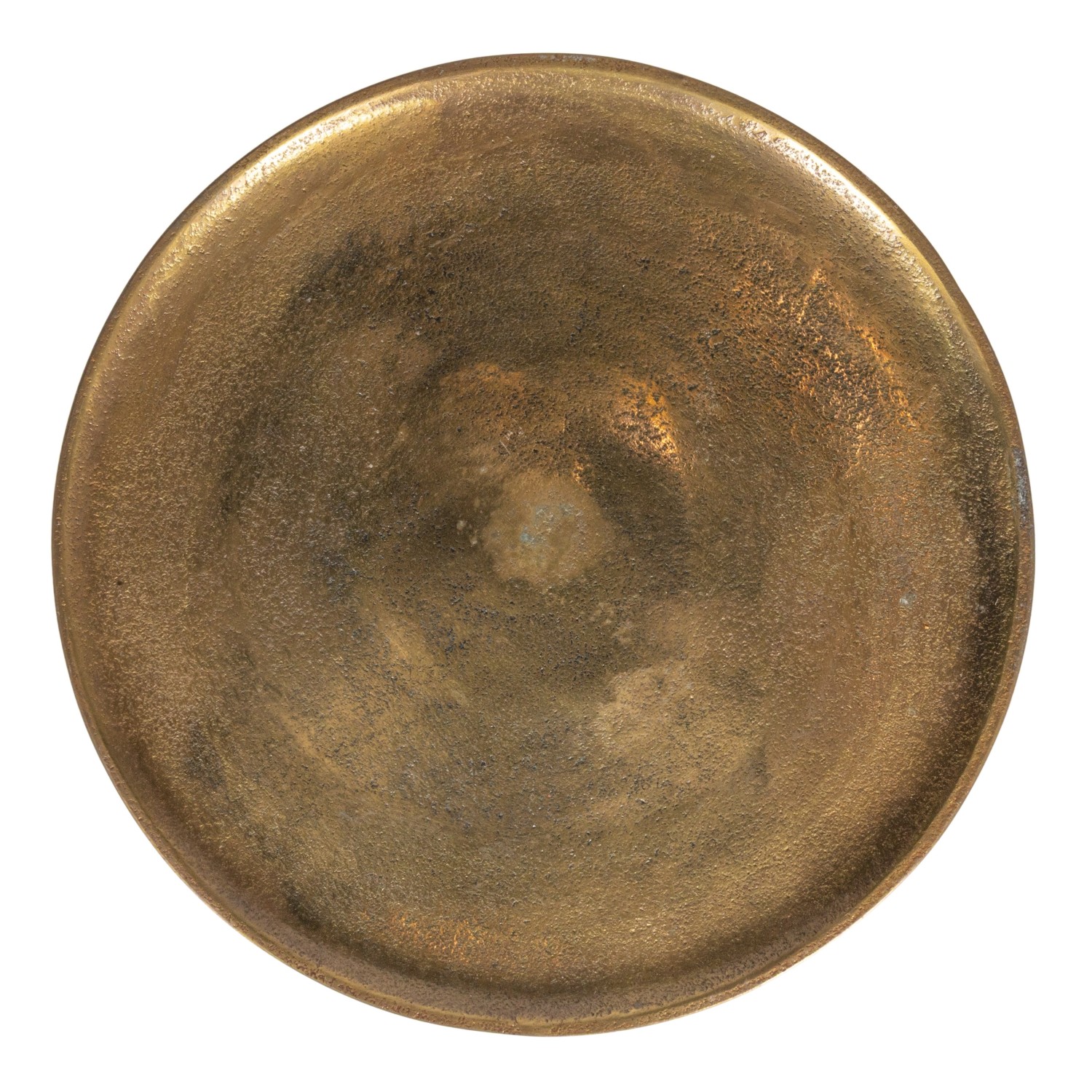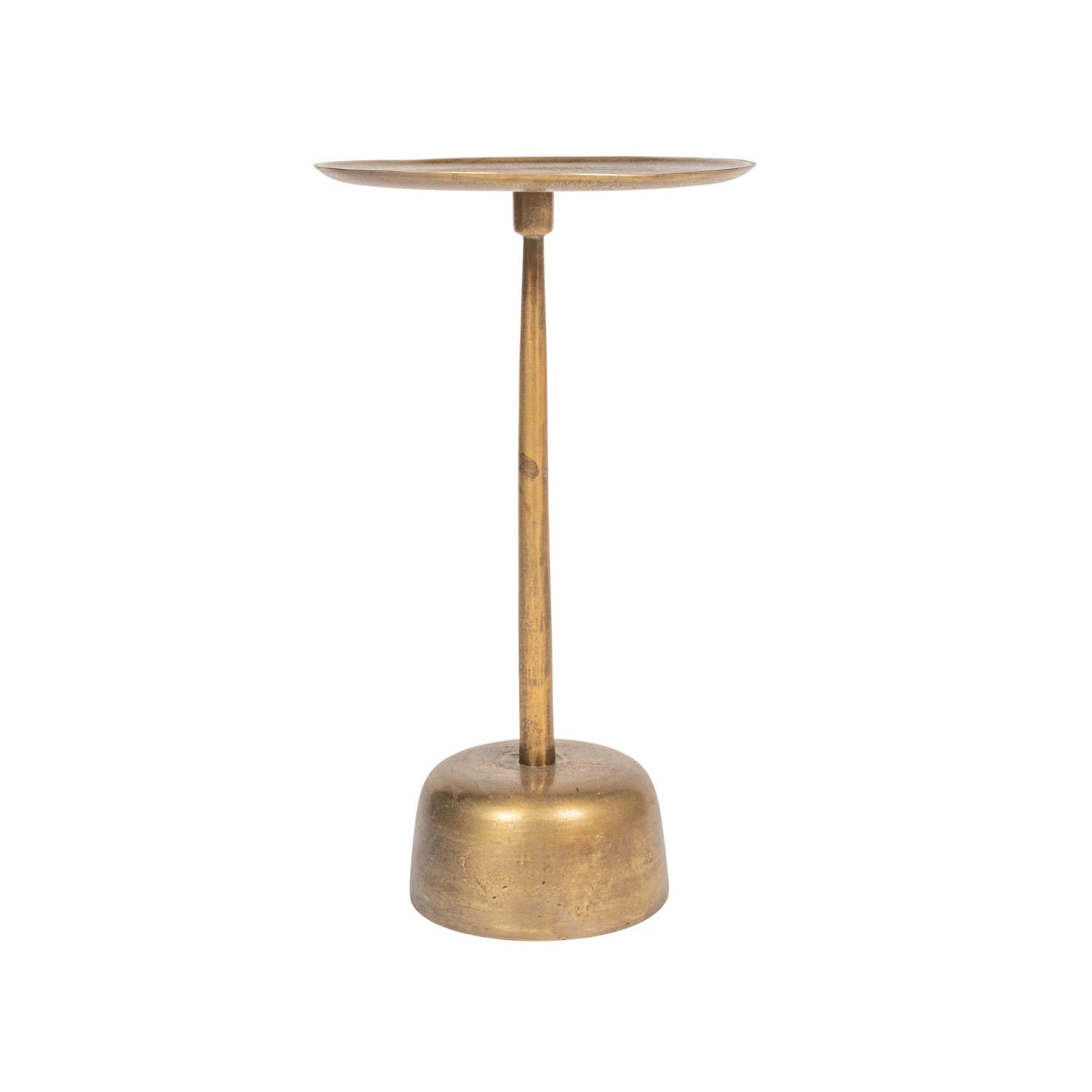 This sleek and elegant side table features a pure aluminum top with a thin stem and an antique brass finish. It is made of lightweight and durable metal that has a smooth and polished surface. The antique brass finish adds shine and sophistication to the table. The table has a round top that can display or store items, such as lamps, vases, candles, or books. The table also has a thin stem that supports the top and creates a minimalist and modern look. The stem has a simple and sturdy design, with a round base that provides stability and support. The table measures 12 inches in diameter and 20 inches in height, with a weight capacity of 44 pounds. The table's size and shape make it suitable for any space, such as living room, bedroom, or entryway. This aluminum side table with a thin stem and antique brass finish adds shine and sophistication to any room. A sleek and elegant side table that features a round aluminum top with a thin stem and an antique brass finish. Perfect for vintage, eclectic, and contemporary home décor styles, adding a touch of elegance to any space. Ideal for adding some shine and sophistication to any room. Made of pure aluminum, a lightweight and durable metal that has a smooth and polished surface.