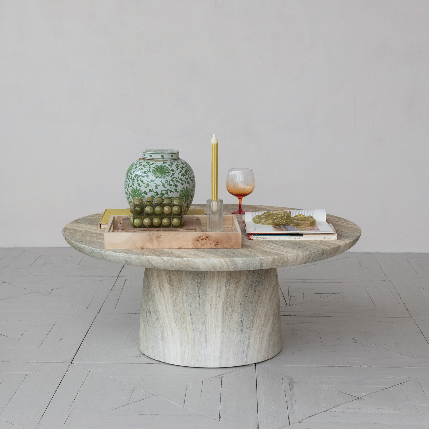 Catalog Name: 39-1/2" Round x 17"H Lightweight Eco Stone Indoor/Outdoor Table, Travertine Finish, Truck Ship