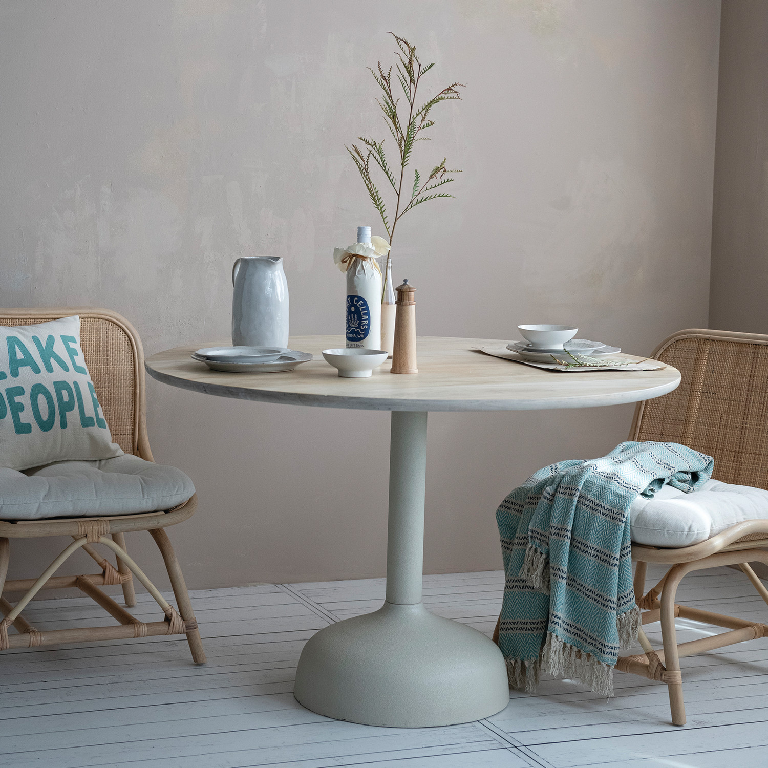 Catalog Name: 47-1/4" Round x 30"H Powder Coated Metal Table w/ Mango Wood Top, Cream Color & Bleached Finish, KD, Truck Ship