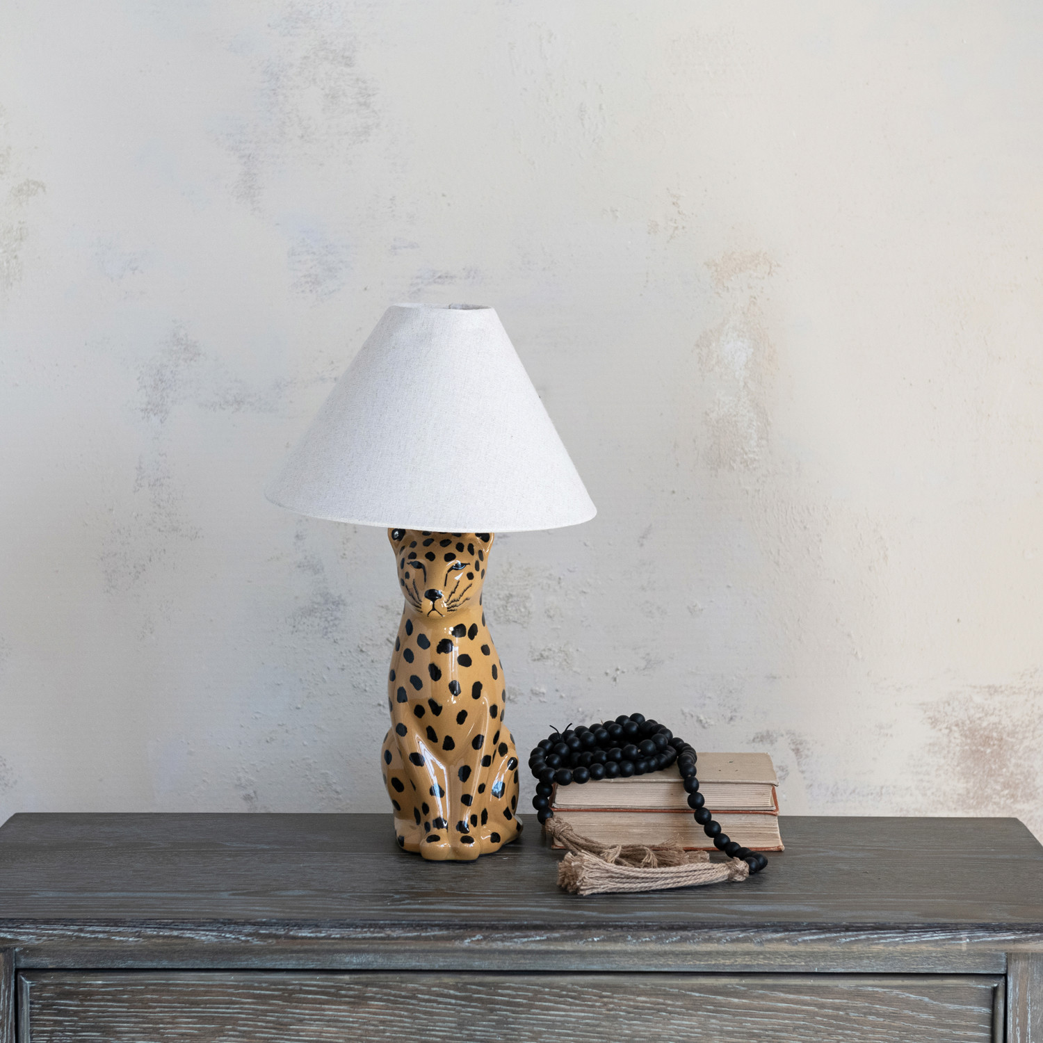 Ceramic Cheetah Table Lamp with Linen Shade & Inline Switch