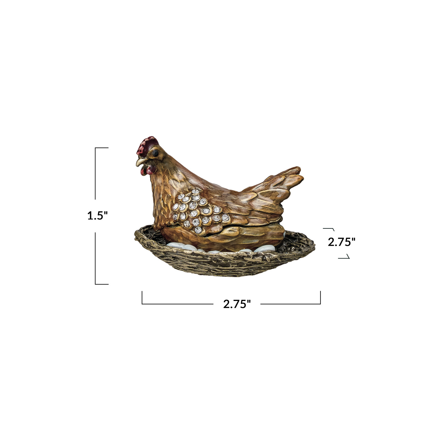 Catalog Name: 2-3/4"L x 2-3/4"W x 1-1/2"H Enameled Metal Hen on Nest Shaped Trinket Box w/ Jewels, Gold Finish & Multi Color