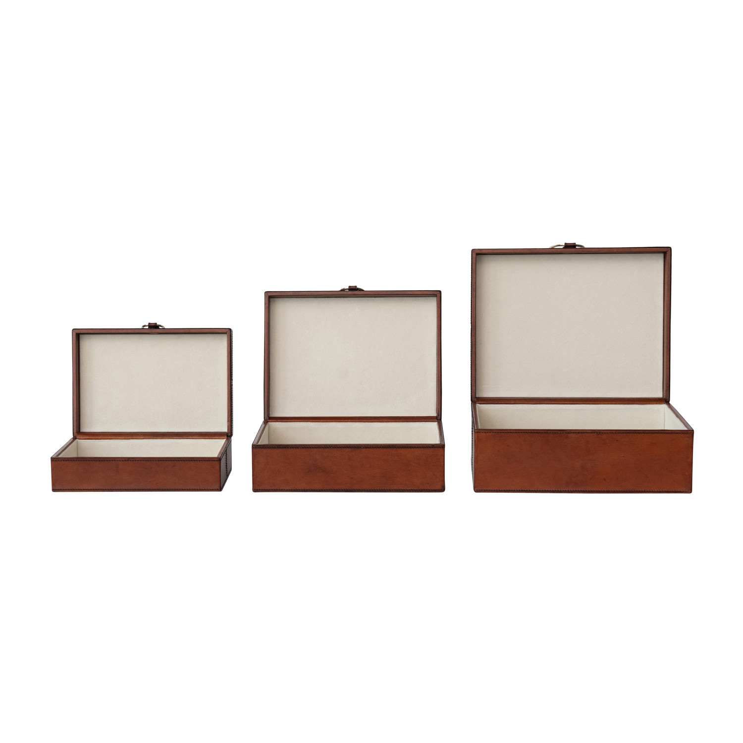 Catalog Name: 11-1/2"L x 9"W x 4-3/4"H, 10-1/4"L x 7-1/2"W x 3-3/4"H & 9"L x 6-1/4"W x 3"H MDF & Leather Nesting Boxes w/ Brass Closures & Flocked Interior, Gold Finish & Cognac Color, Set of 3