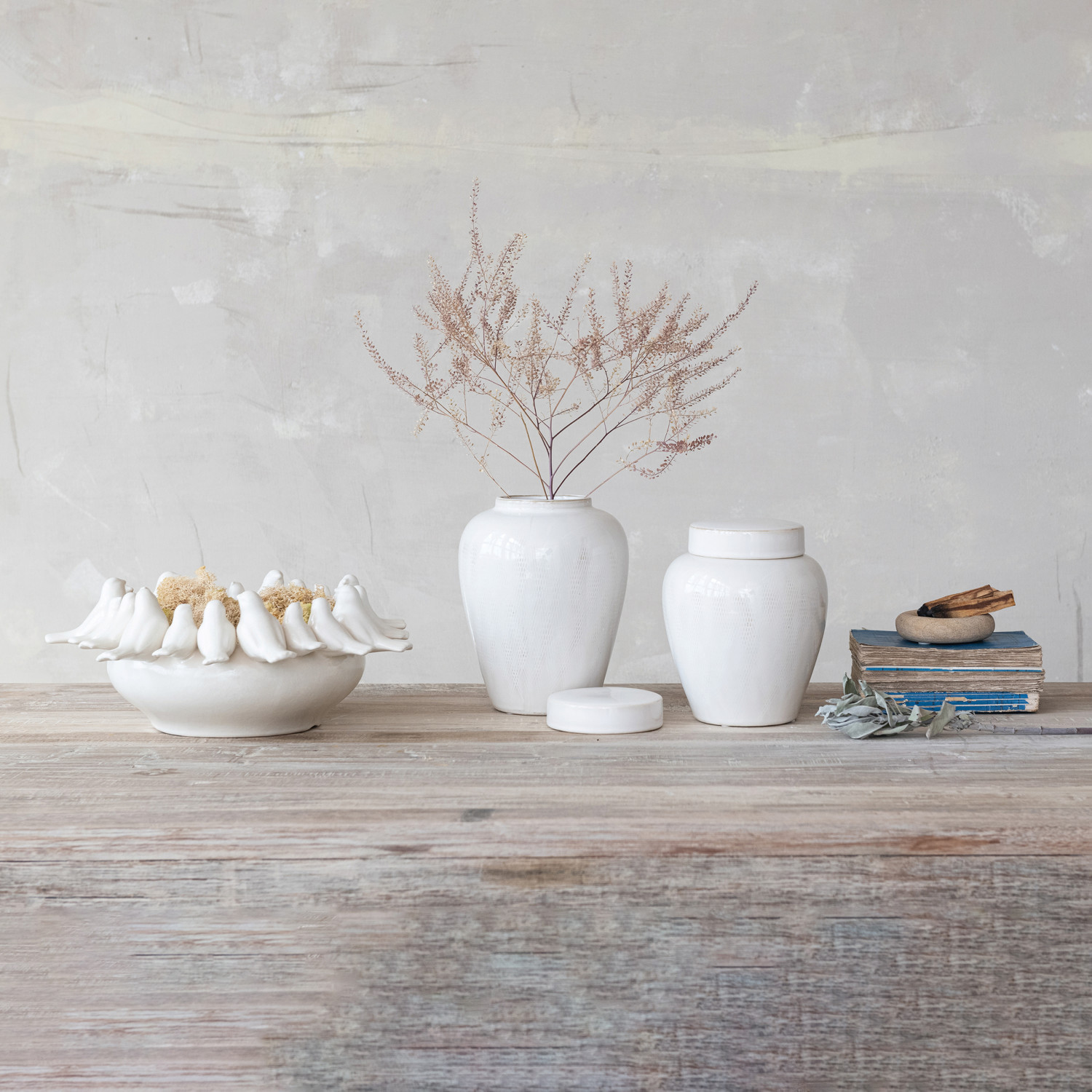 Catalog Name: 6-1/2" Round x 7-3/4"H Decorative Debossed Stoneware Ginger Jar w/ Linen Texture & Lid, Reactive Glaze, White (Each One Will Vary)